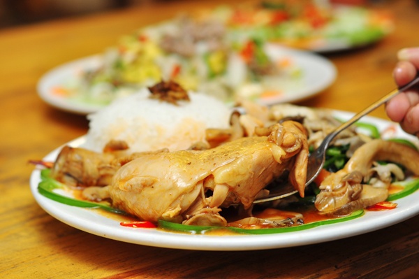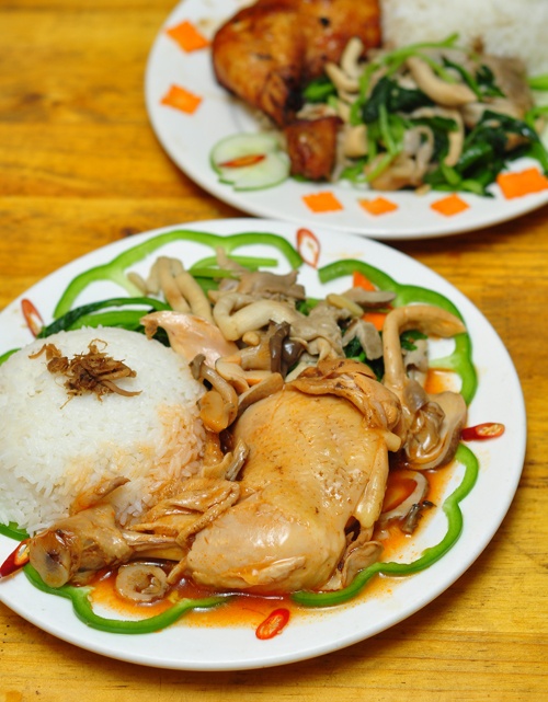 Chắc dạ nên cơm vẫn được nhiều khách công sở gọi nhất, đặc biệt là các khách nam. Cơm gà sốt nấm, cơm nấm gà nướng là những thực đơn rất đầy đặn với nguyên chiếc đùi lớn ăn ra cả phần má. Điểm cộng, gà không phải loại công nghiệp mỡ màng, bở bục nên ngon miệng, không ớn ngấy. Kết hợp thêm rau và các loại nấm được quảng cáo là 100% nấm Việt, phần cơm như vậy vừa đủ no mà có chất cho khách. Tất nhiên, giá cũng tương xứng: 55.000 - 65.000 đồng/suất.