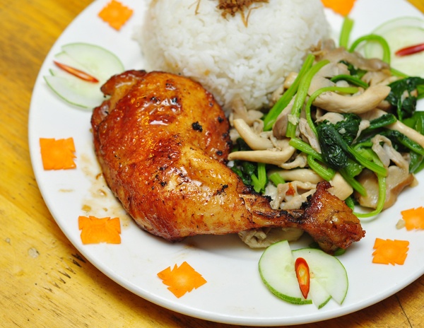 | Cơm nấm gà nướng nguyên đùi 65.000 đồng/suất. |