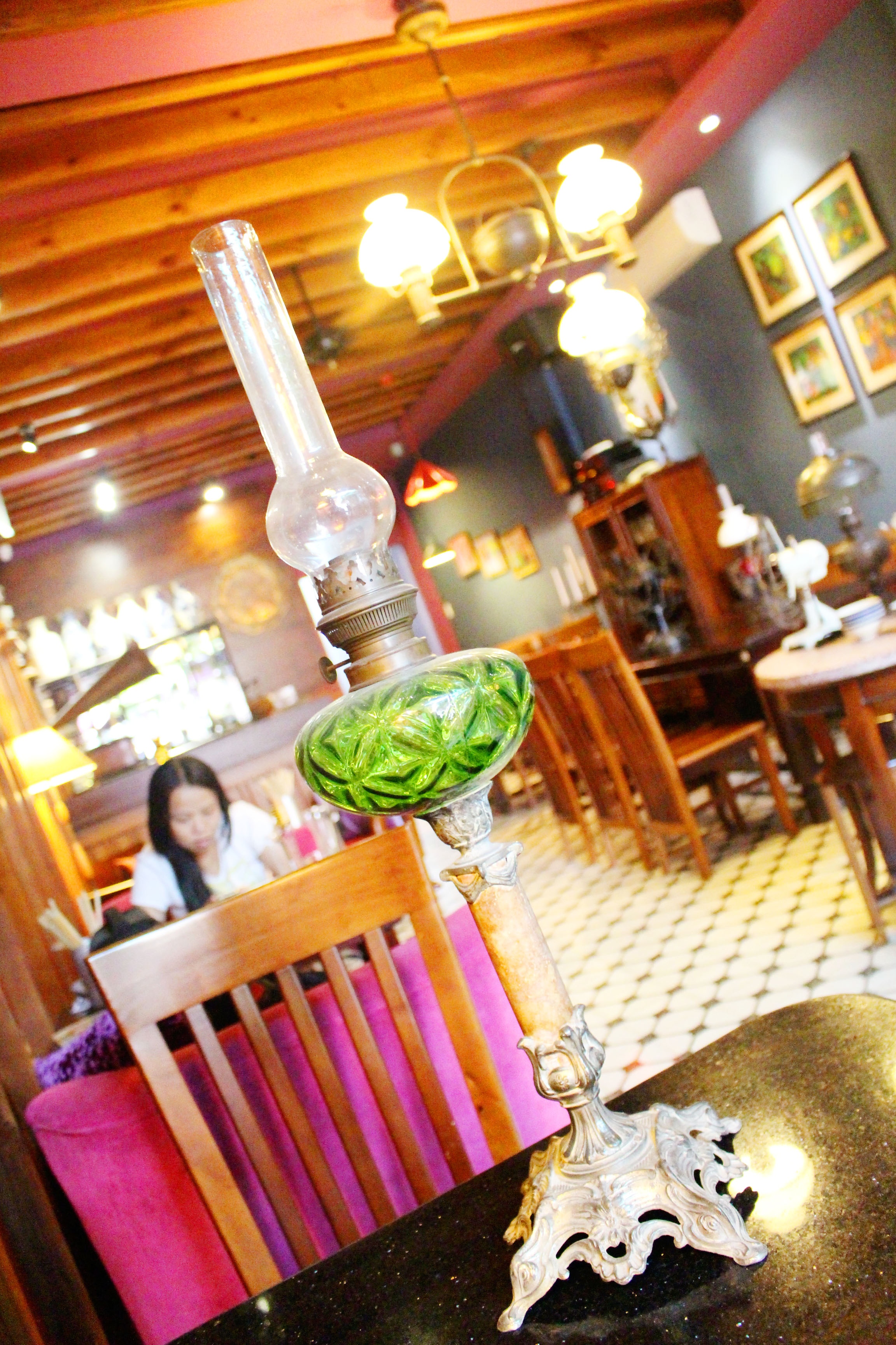 | Quán được trang trí bằng bộ sưu tập quạt cổ và đèn cổ. |