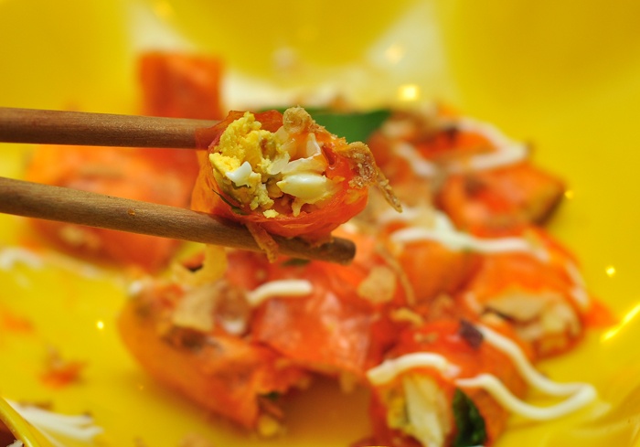 | Bánh tráng để nguyên bản, cuộn lại bên trong có nhân trứng, khô bò, đu đủ dầm, hành khô... sau đó phủ thêm lạc, tương ớt, sốt mayonaise. |