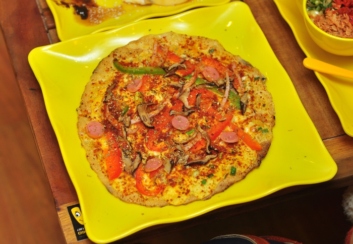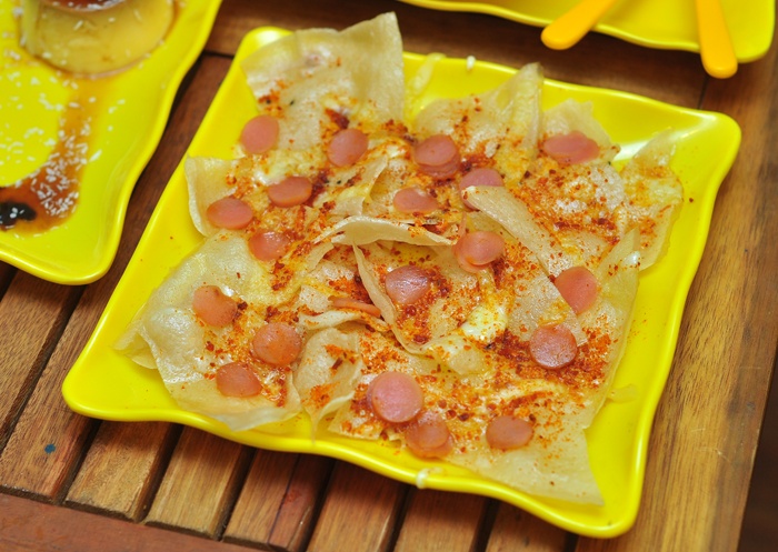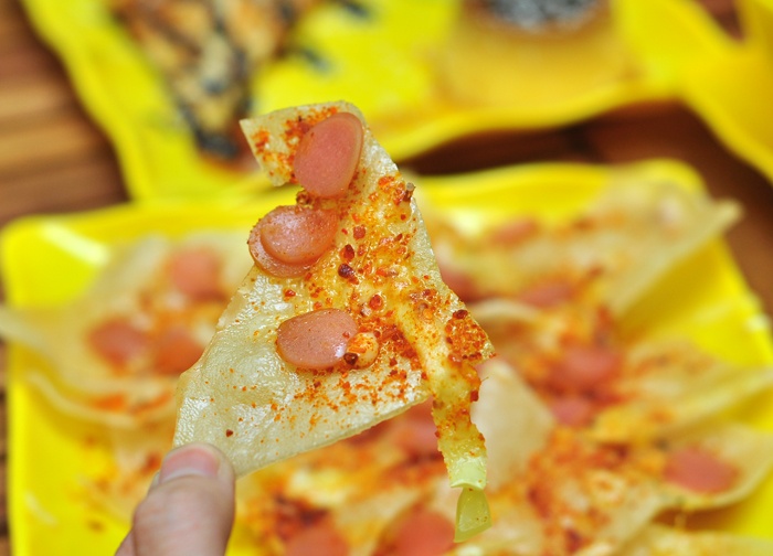 Pizza Vàng Khè cũng là một sáng tạo của chủ tiệm. Vẫn có phần nhân phô mai, xúc xích, nấm, ớt xanh, lá thơm hệt như chiếc pizza truyền thống nhưng đế bánh lại là bánh tráng nướng nóng giòn. Món pizza biến tấu này rất đẹp mắt.
