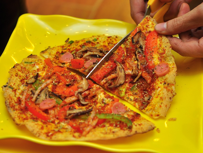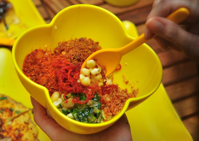 | Khi ăn, khách nên phủ thêm tương ớt, tương cà, sau đó dùng kéo cắt rồi gập gọn gàng lại để thưởng thức. |