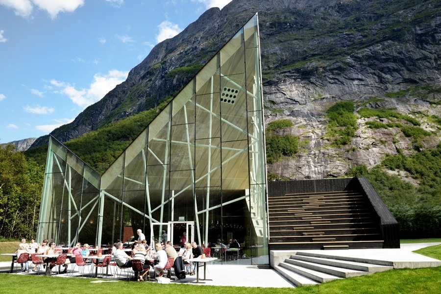| Với chiều cao lớn vượt trội của mặt tiền phủ kính, khách hàng dễ dàng thưởng thức đầy đủ không gian cảnh quan thiên nhiên nơi đây. Mái của tòa nhà được lấy ý tưởng từ chính các ngọn núi. Những nhà thiết kế nhà hàng hy vọng rằng tòa nhà Troll Wall sẽ là một ngọn núi nhân tạo “sống” hòa đồng với thiên nhiên xung quanh nó. |