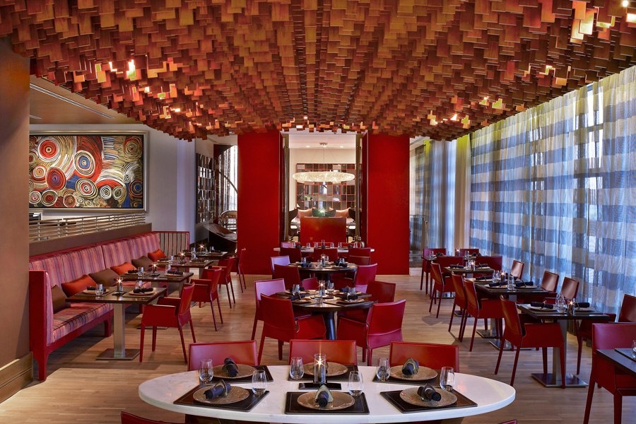 | Trong khu ăn uống, tông màu đỏ của những chiếc ghế kết hợp với tông màu nâu trầm của sàn nhà gỗ và những tấm gỗ trang trí trên trần tạo nên một không gian ấm cúng. Nơi đây mang lại cho khách hàng một bầu không khí sang trọng, ấm áp trong khung cảnh hiện đại. Ngoài ra, sự phục vụ nhiệt tình, chuyên nghiệp và tinh tế của các nhân viên nhà hàng cùng với một thực đơn đa dạng, đáp ứng được nhu cầu của khách hàng sành ăn nhất là những điểm cộng đắt giá cho nhà hàng này.