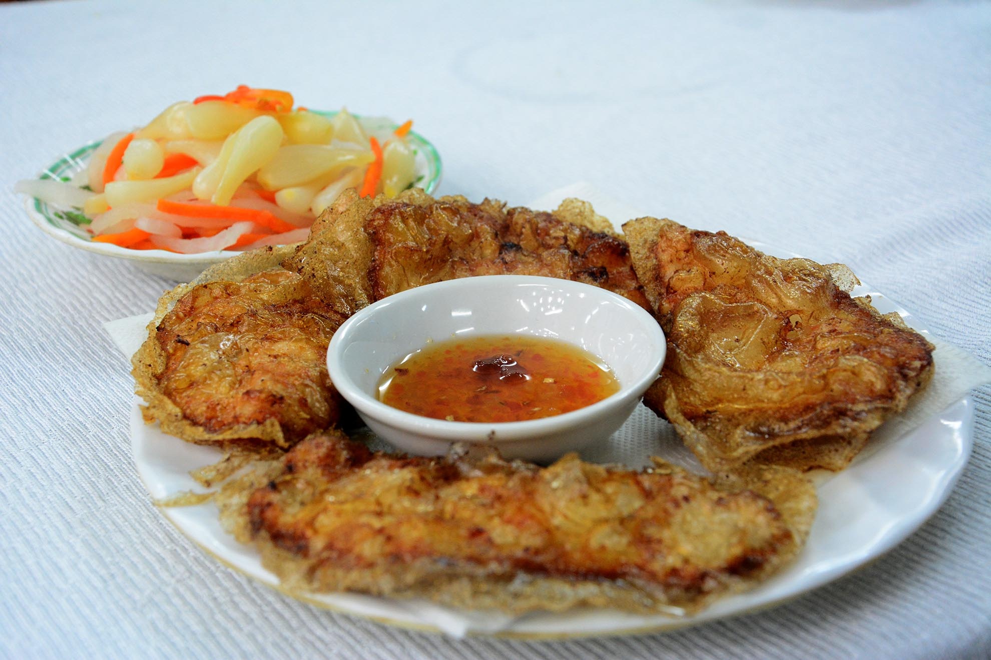 | Đó là món chả tôm được bọc trong bánh tráng phơi sương chiên giòn chấm xí muội. |