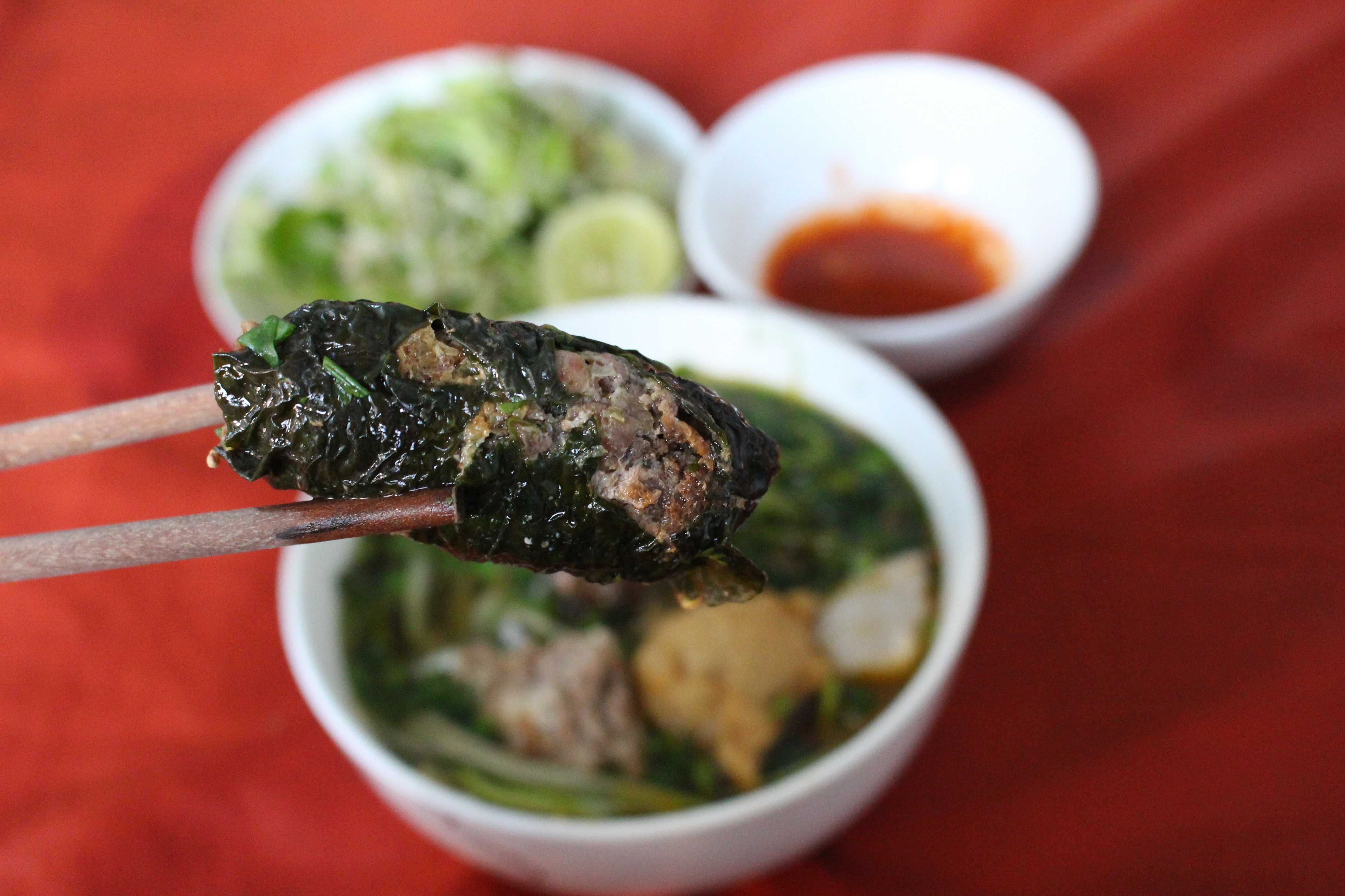 | Chả lá lốt đầy đặn song không bị khô. Chả cua được giã bằng tay và tẩm ướp vừa miệng. Quán bán khoảng 10 món bún. |
