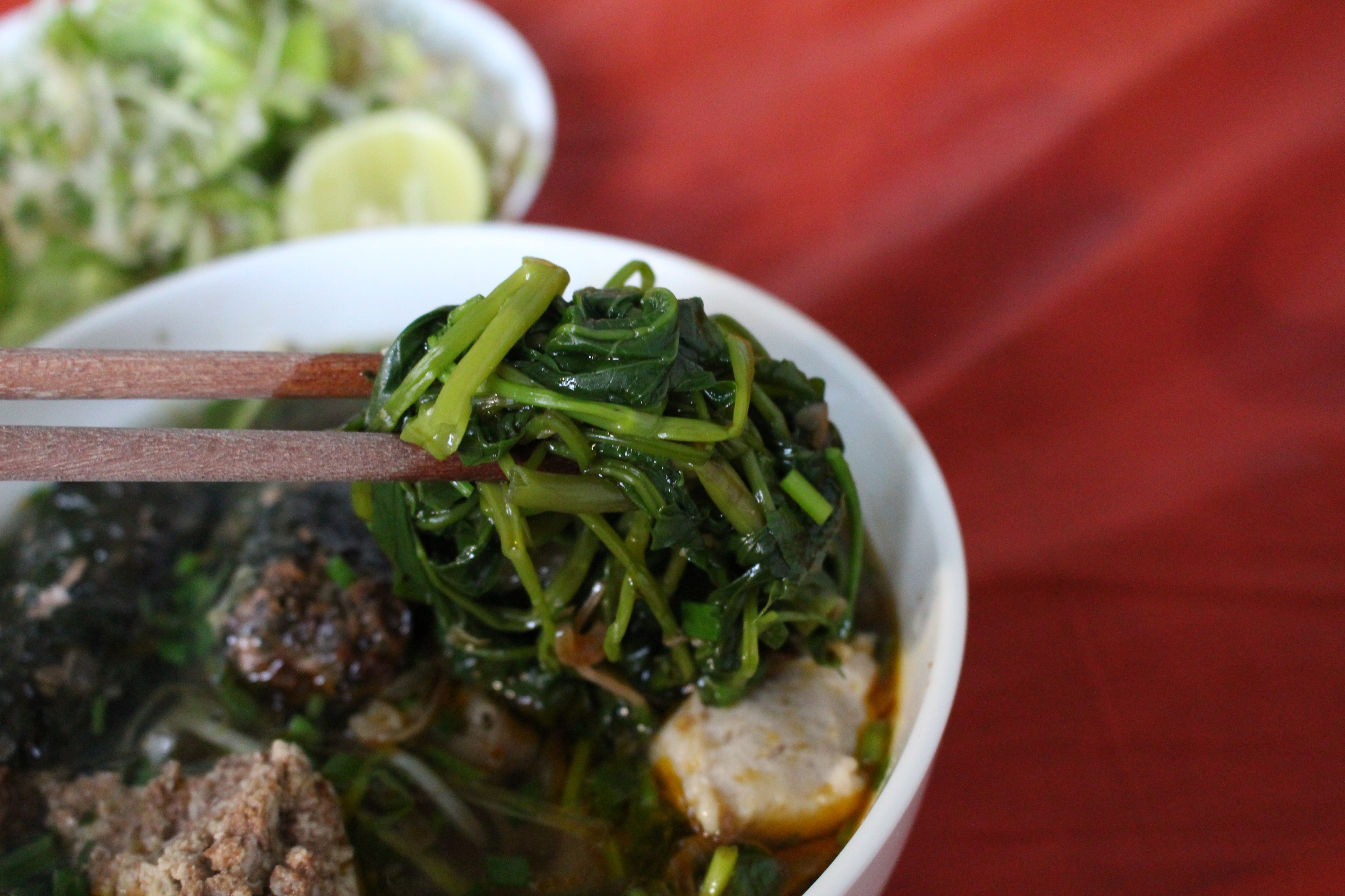 Gọi như thế vì ngoài những thành phần phải có gồm riêu cua, chả lá lốt, chả cua, mọc... món ăn này có lượng lớn rau muống luộc, gốc hành lá chẻ dọc, rau sống...