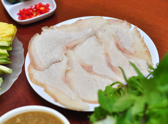 So với nhiều tiệm ở Hà Nội, bánh tráng thịt heo quán này giá mềm hơn - 40.000 đồng/suất. Đĩa thịt có 6 miếng heo ba chỉ nạc mỡ xen kẽ đều đặn, thịt thái to bản mà không hề mỏng tang, rau sống, đồ ghém thì “xông xênh”, đầy đặn. Đặc biệt, mắm nêm sanh sánh, đậm đà, dậy mùi có vẻ rất chuẩn. Nhìn chung, các chị em ghiền bánh tráng thịt heo đều chấm cho quán này điểm 7-8.