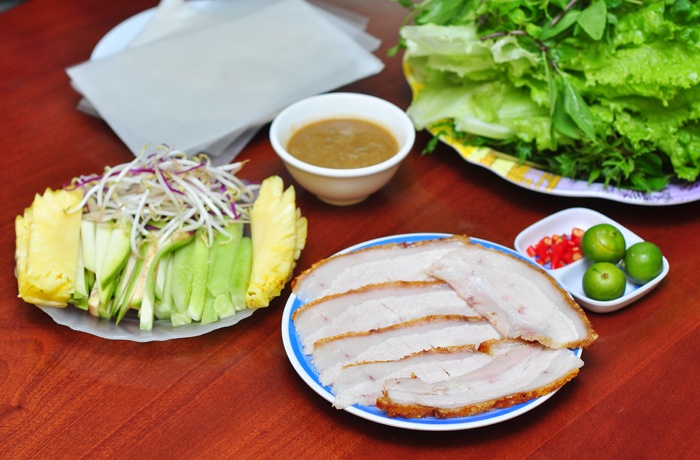 Thịt heo quay có phần bì giòn tan như "mới ra lò" nên ăn rất đã. 50.000 đồng/suất, bánh tráng thịt heo quay ở đây được đánh giá là ngon rẻ.
