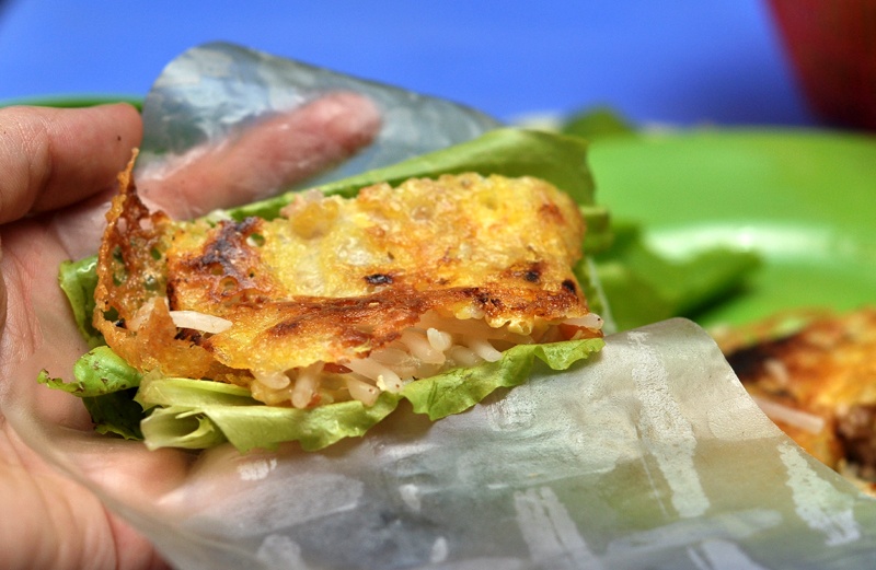 Vỏ bánh trông rõ có phủ lớp trứng mỏng bên trong, ngoài giá đỗ với vài con tôm nhỏ, chủ quán sử dụng thit heo băm chứ không cho thịt bò.