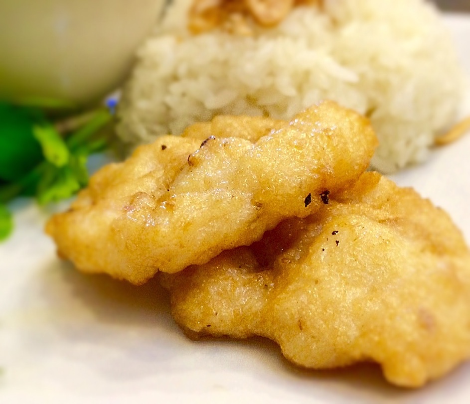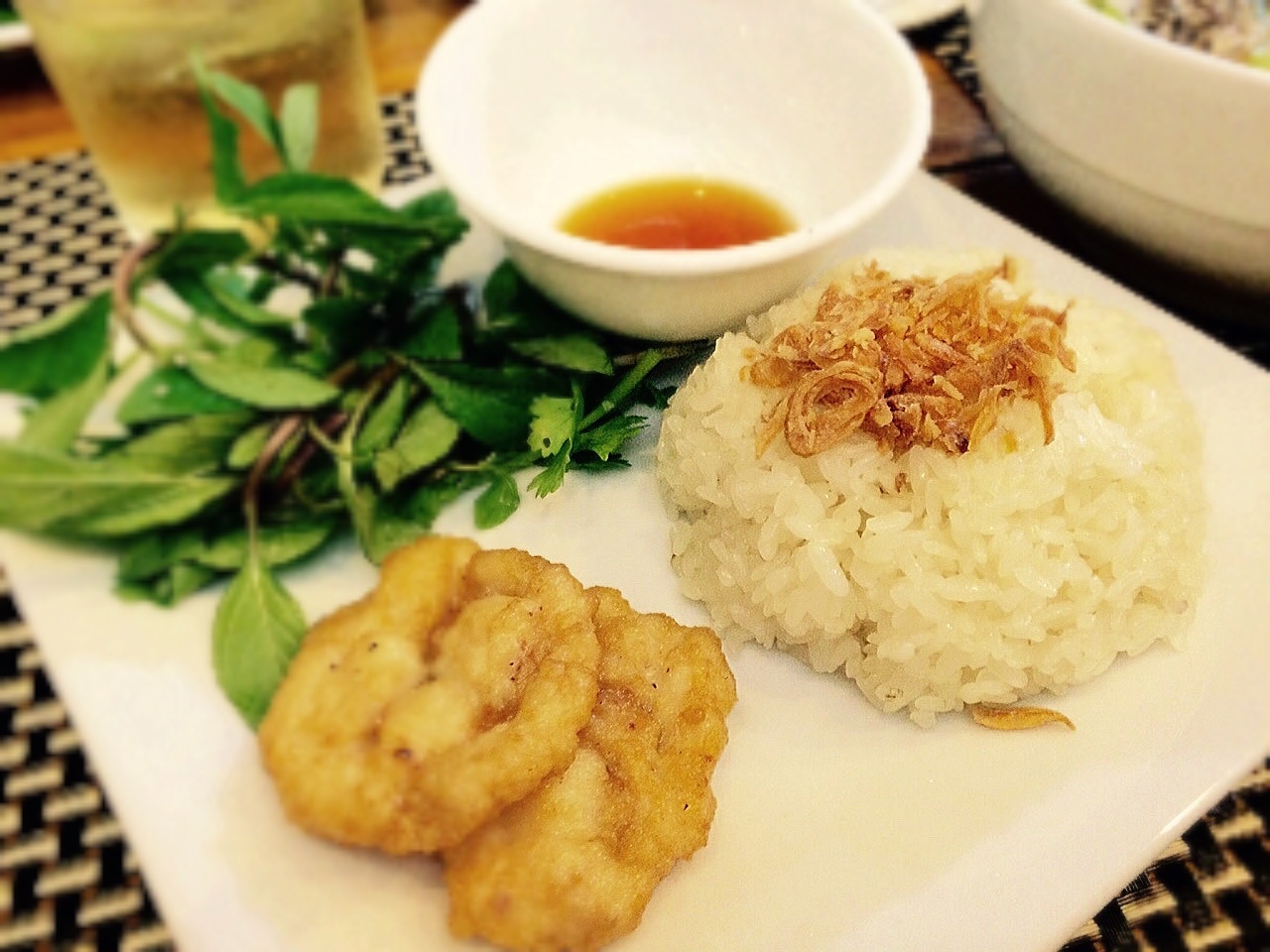 Xôi chả mực được trang trí theo kiểu món ăn văn phòng. Suất xôi nhìn hơi ít, gồm một phần xôi nhỏ, 2 chiếc chả mực, chén nước mắm, rau sống đi kèm.