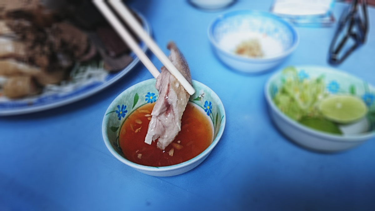 Thịt vịt ở đây là những con vừa, ít mỡ, lớp da mỏng, chế biến khéo nên thịt thơm, mềm chứ không có mùi hay dai thường thấy. Đi kèm đĩa gỏi vịt là mắm gừng có vị chua, cay nhẹ.