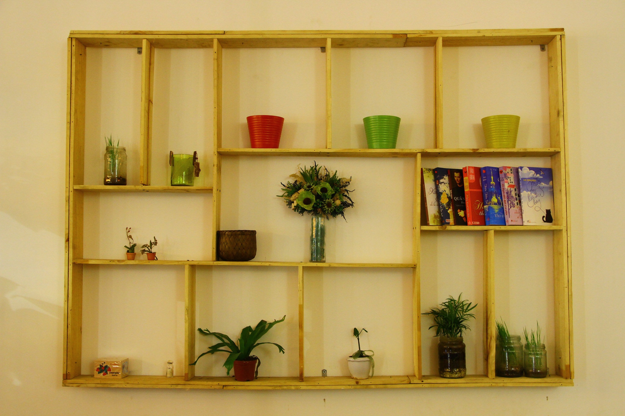 Những chậu cây còn được bố trí trên những giá sách treo tường. Những chiếc bình thủy tinh cũng được tận dụng để trồng cây. Khách uống cà phê có thể thoải mái lựa chọn những cuốn sách phù hợp để đọc. Thậm chí, bạn có thể mượn những chậu cây đẹp trên giá để ngắm nhìn, hoặc đặt thêm trên bàn của mình. |