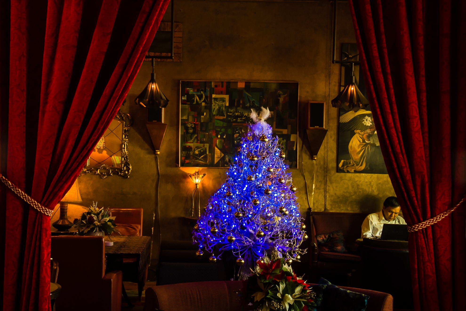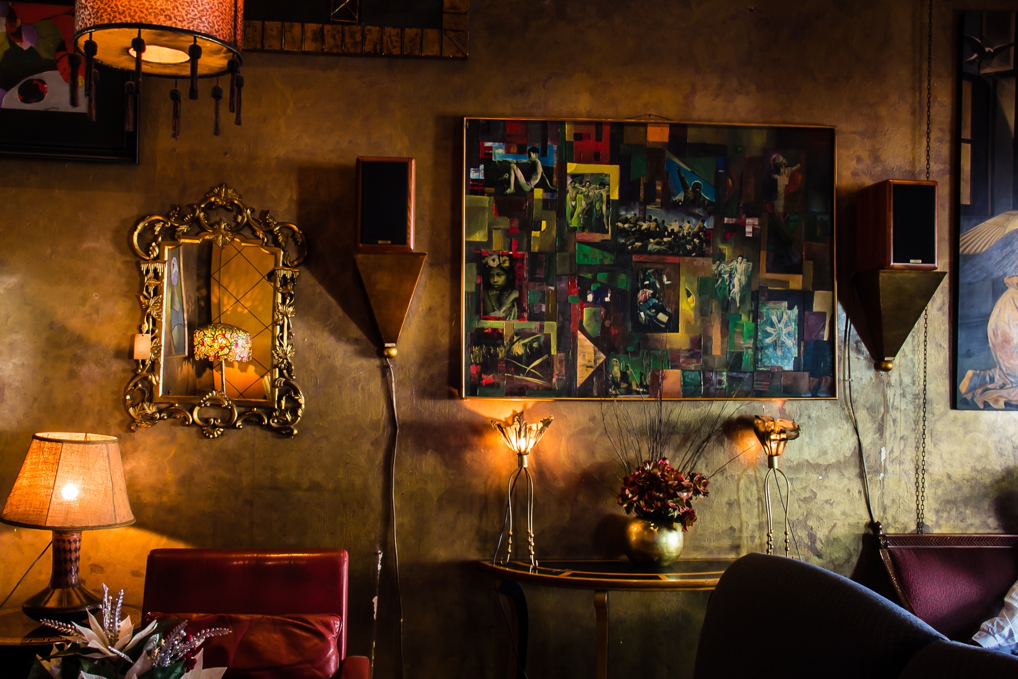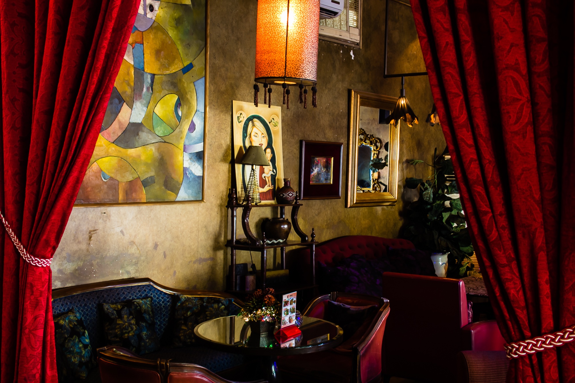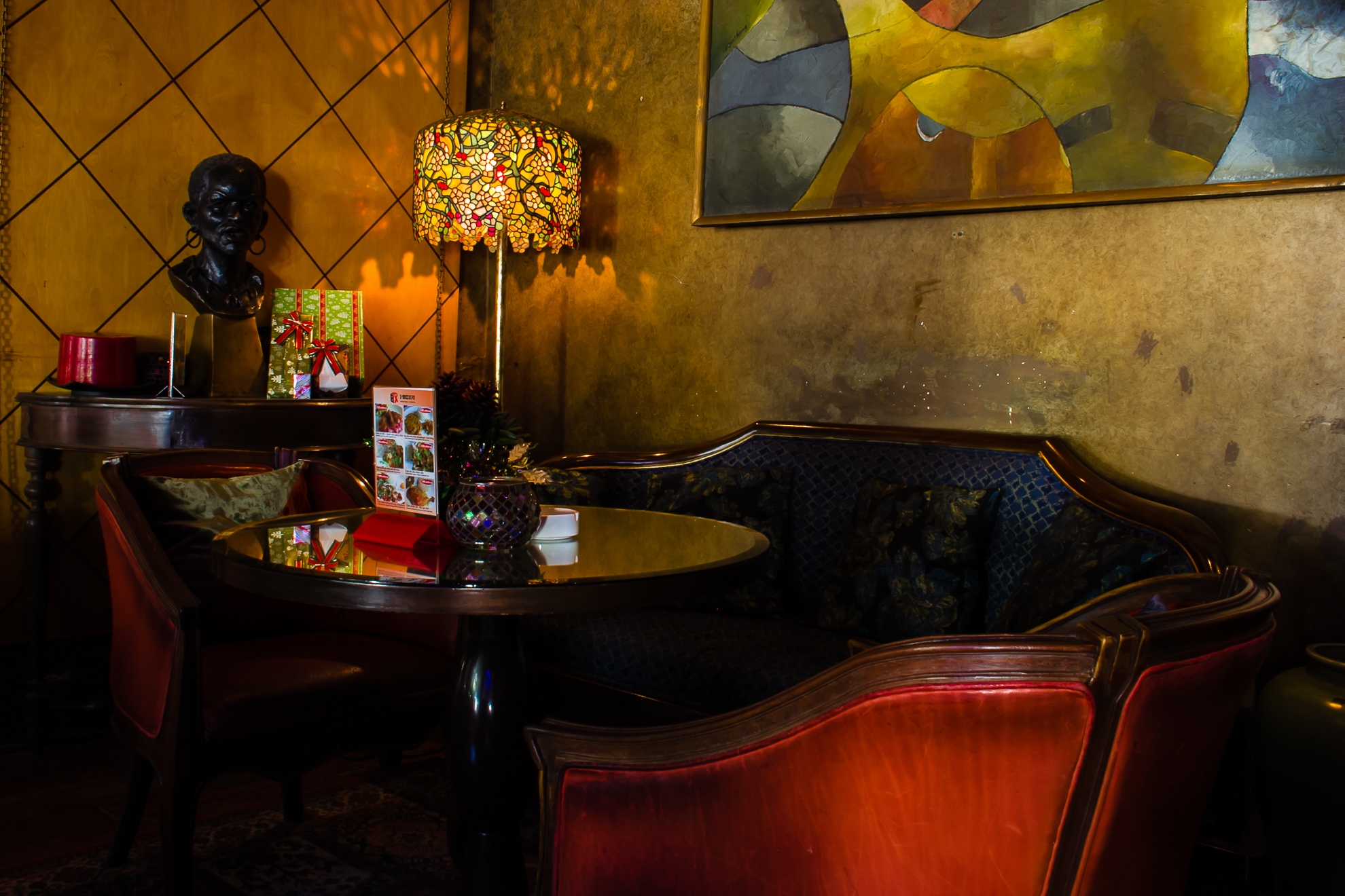 Quán được trang hoàng bằng những bộ tràng kỷ tinh xảo, sofa, tranh lập thể nhiều tầng nghĩa, hệ thống đèn cầu kỳ.
