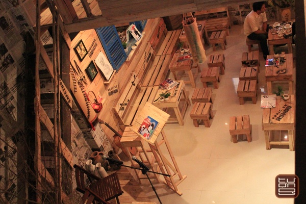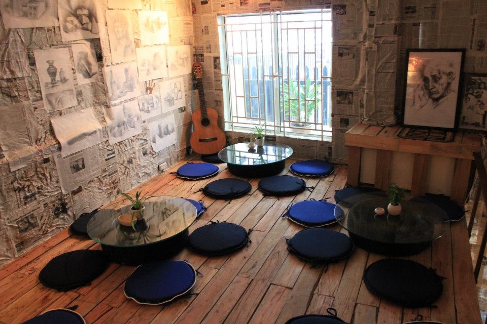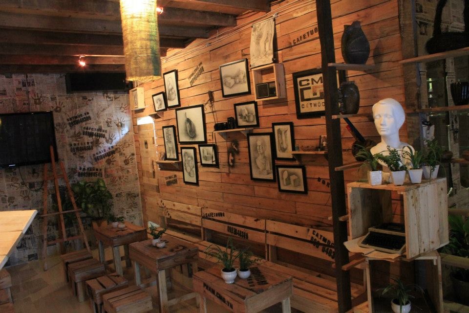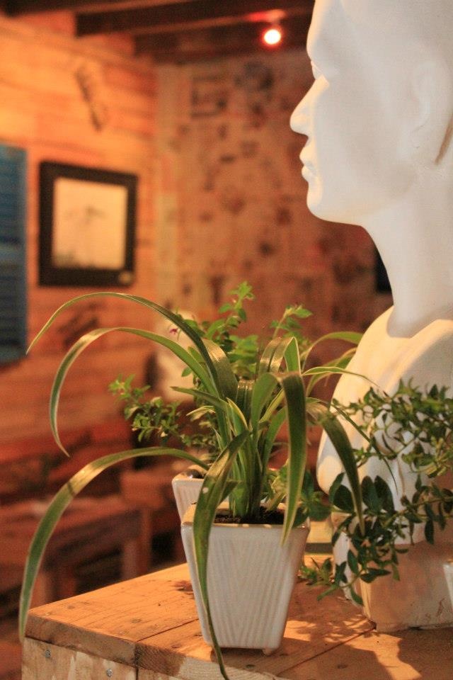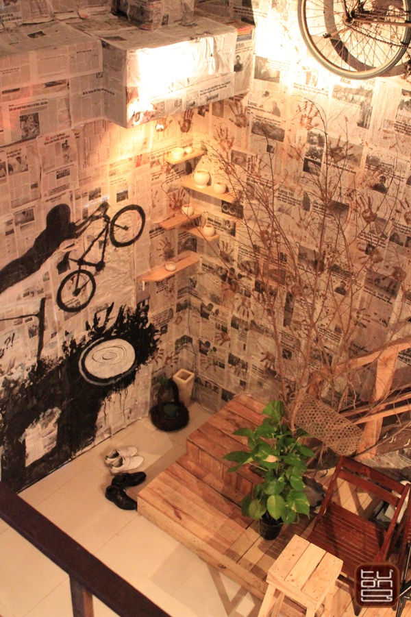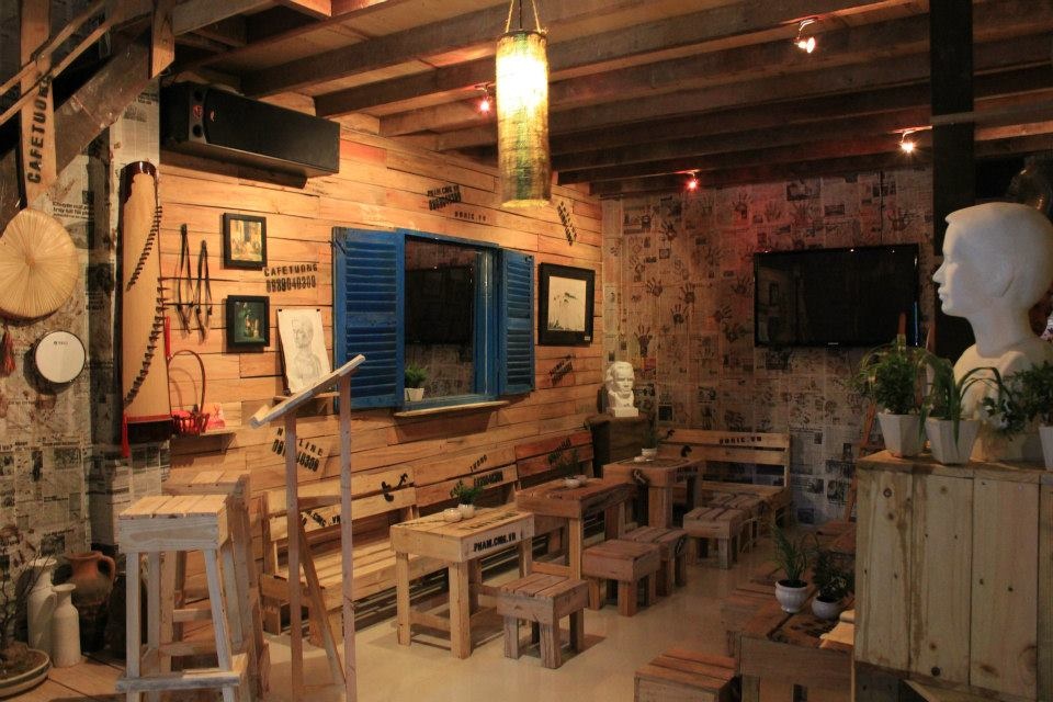 Được thiết kế bởi những kiến trúc sư “cứng cựa”, nên dù chỉ sử dụng những vật liệu đơn giản nhất như bộ bàn ghế gỗ mộc, giấy báo, bánh xe cũ, hoa, đèn… Tượng vẫn lôi cuốn những người trong nghề hay những ai vô tình đến quán.