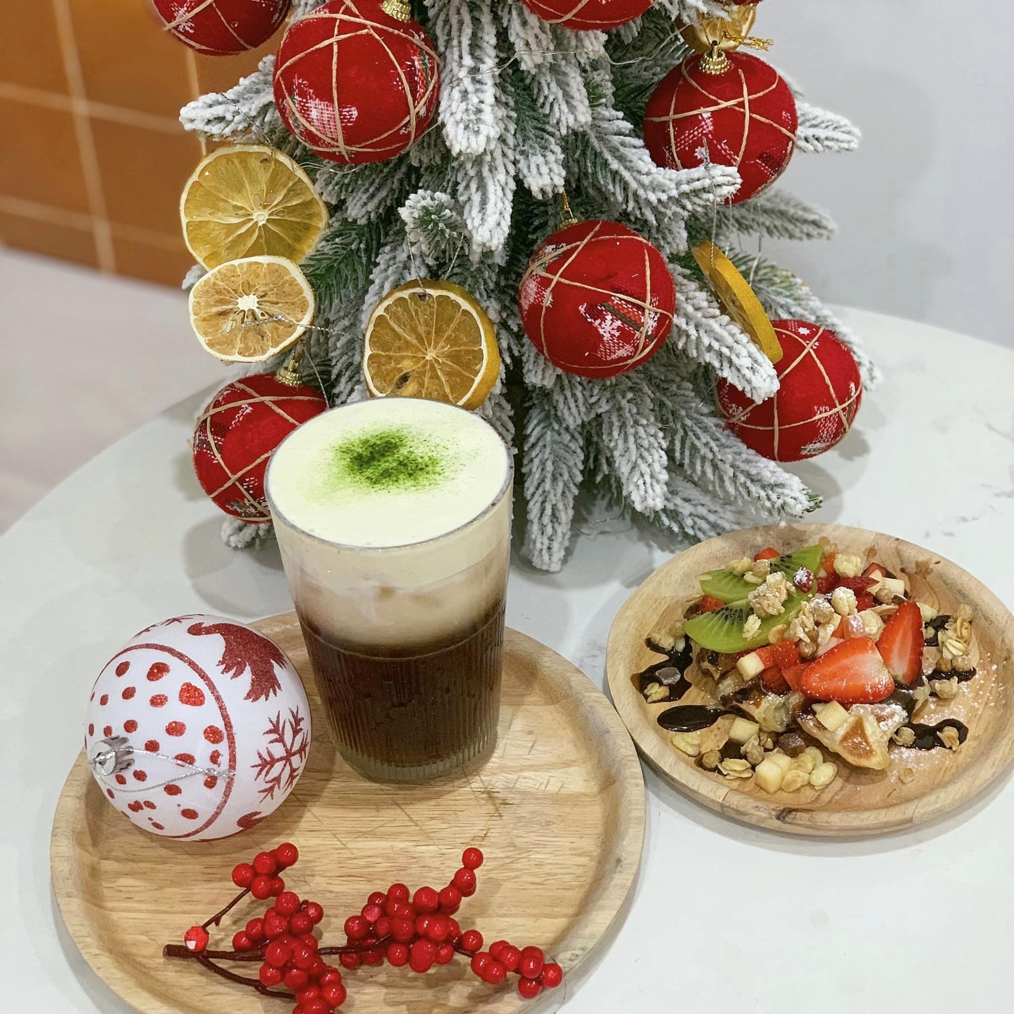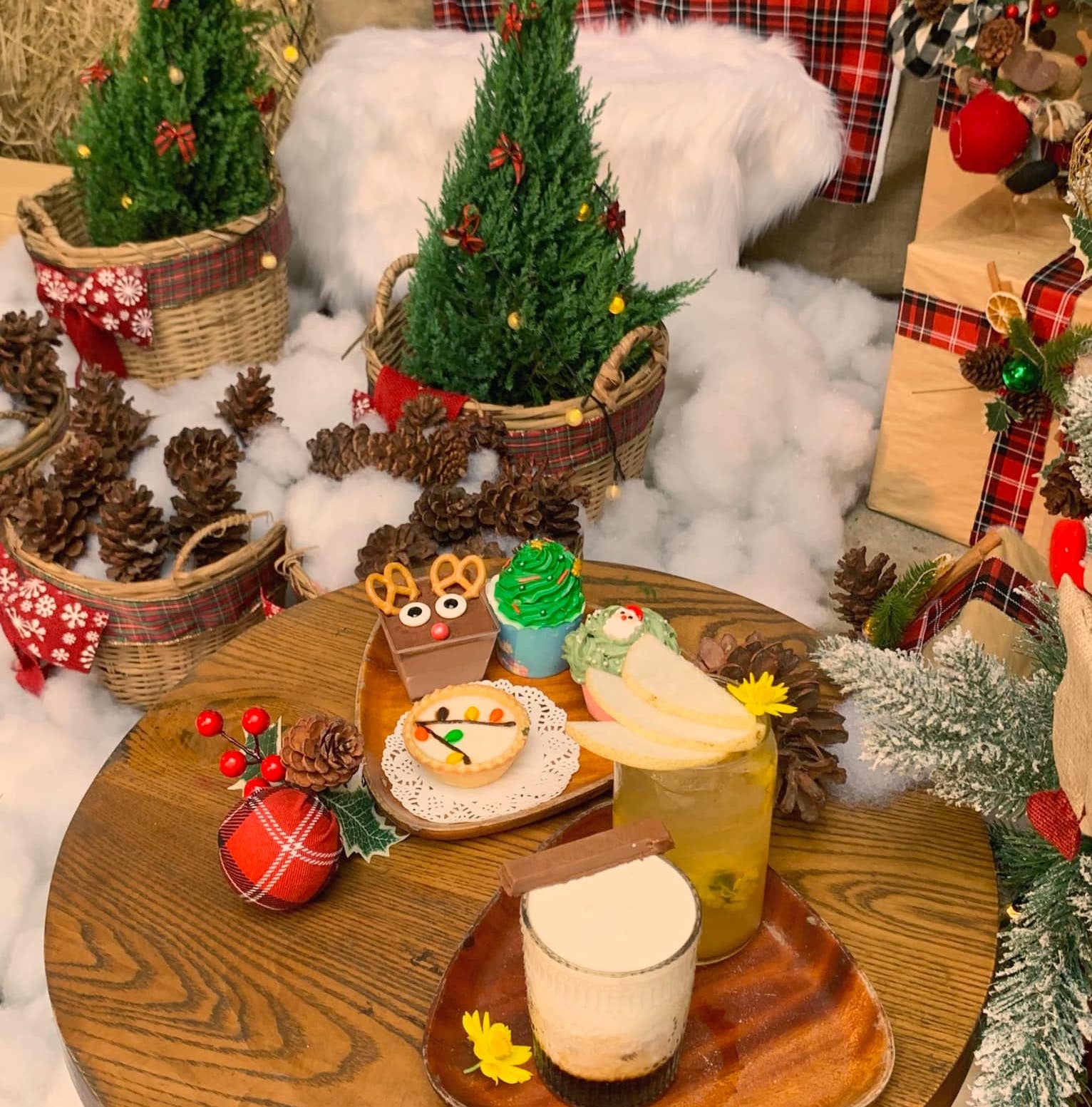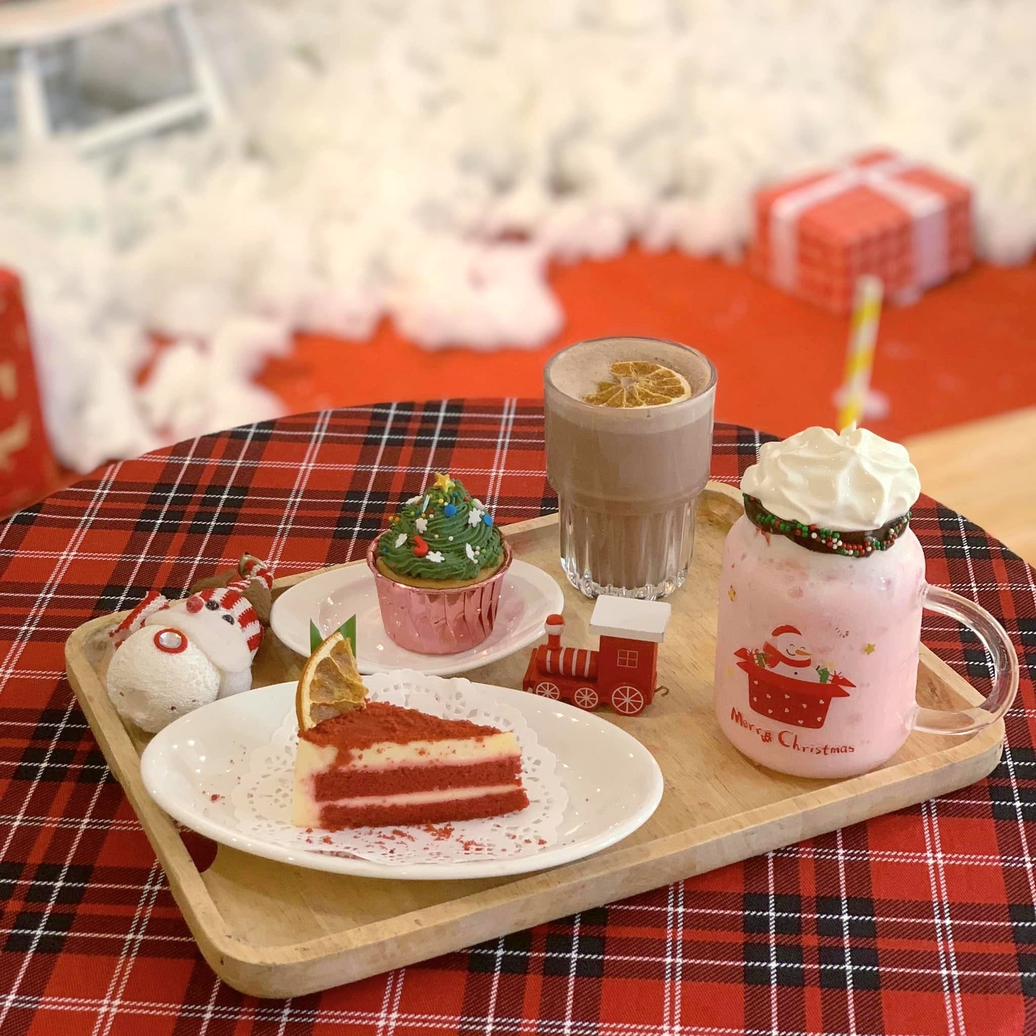 Nổi bật nhờ 6 góc decor có cây thông, hộp quà, tuần lộc... tiệm Cafein. (Tân Phú) với không gian ấm cúng và đậm chất Noel là một trong những nơi đầu tiên Trang tìm đến chụp hình dịp này. Không chỉ sở hữu khung cảnh bắt mắt, quán còn phục vụ những thức uống, bánh đặc trưng mùa lễ hội.