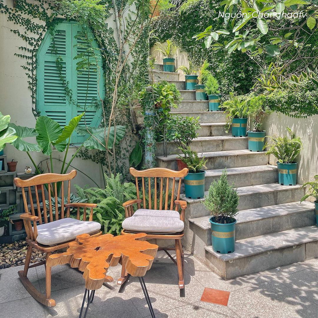 Đúng như lời giới thiệu, quán tựa Đà Lạt thu nhỏ giữa lòng Hà Nội với không gian xanh mát. Tầng 1 là khoảng sân nhỏ đầy nắng với vài bộ bàn ghế cùng cây xanh được bày bán. Theo cầu thang lên tầng 2, không gian nhẹ nhàng, ấm cúng, thích hợp để làm việc, học nhóm hay gặp gỡ bạn bè.