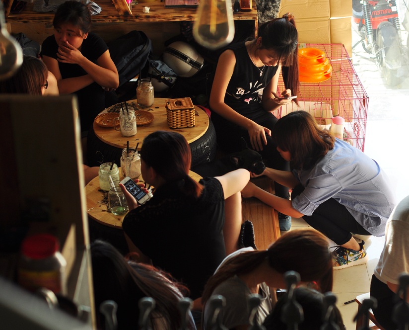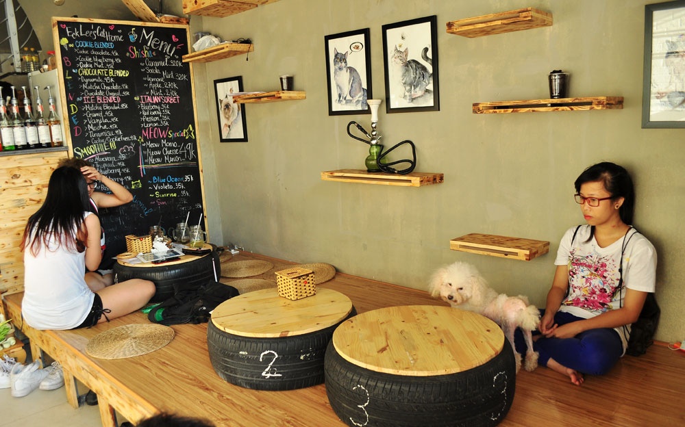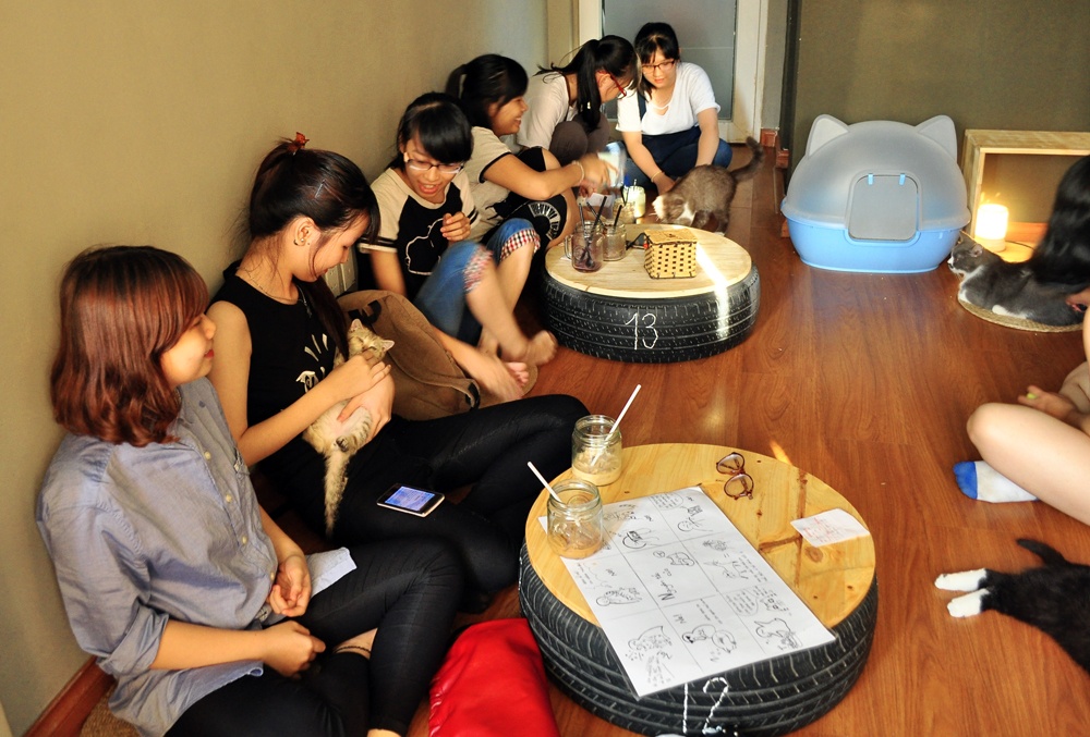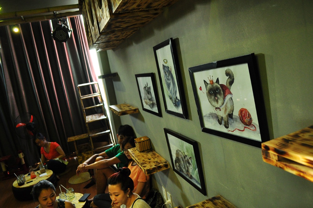 Quán có 3 tầng và tầng nào cũng đầy không khí yêu mèo. Phần đông khách ở đây đều là các cô gái trẻ. Họ thường đi đôi, đi nhóm, cùng ngồi trò truyện và cùng nhau nựng mèo.