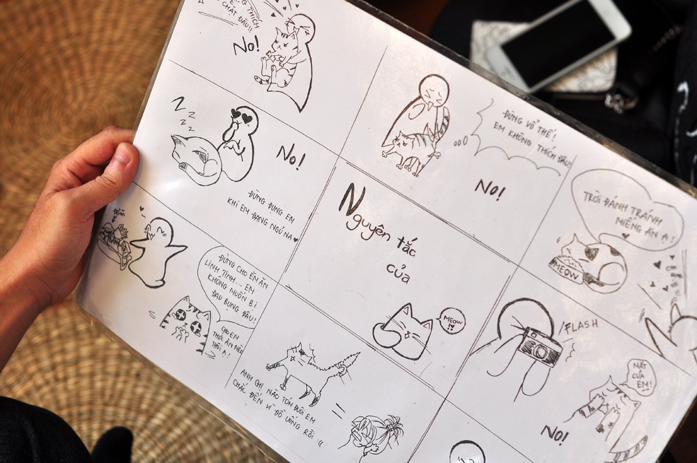 Quán cũng phải chủ động xây dựng một bảng nguyên tắc cho khách khi "giao lưu" với mèo. "Có vậy mới bảo đảm an toàn cả khách lẫn mèo. Thực tế là những hôm đông, mèo nhà mình đã bị nhiều khách vần đến mệt, thậm chí có con bị ốm phải đưa đi bác sĩ", chủ quán chia sẻ.