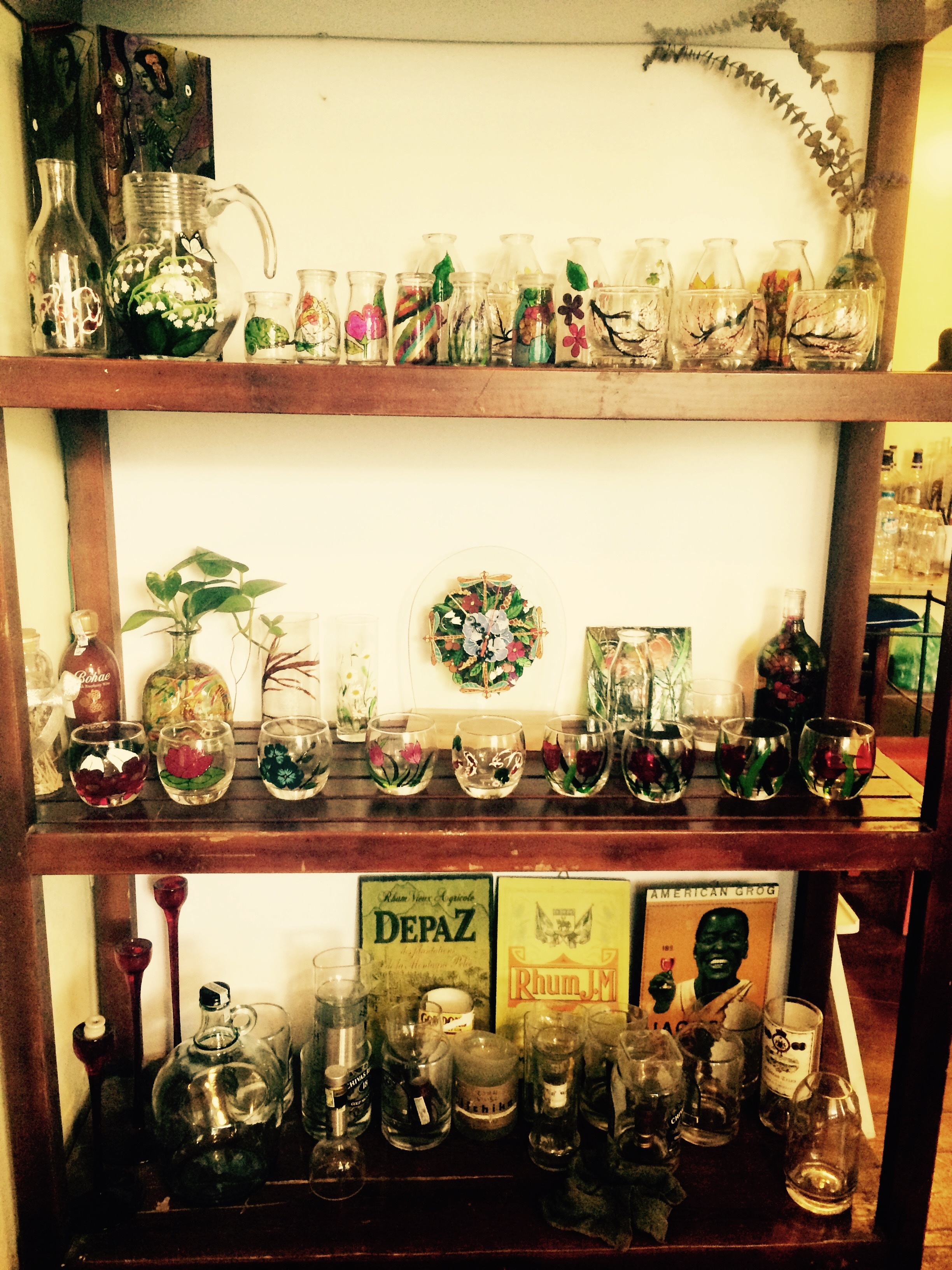 Dù quán có phong cách "cũ nát" không còn mới lạ, bước vào đây, khách lại thấy thích thú trước bộ sưu tập vật dụng thủy tinh lạ mắt. Kệ đồ chai, lọ, cốc, bình, đồng hồ... sặc sỡ khiến ai cũng tò mò.