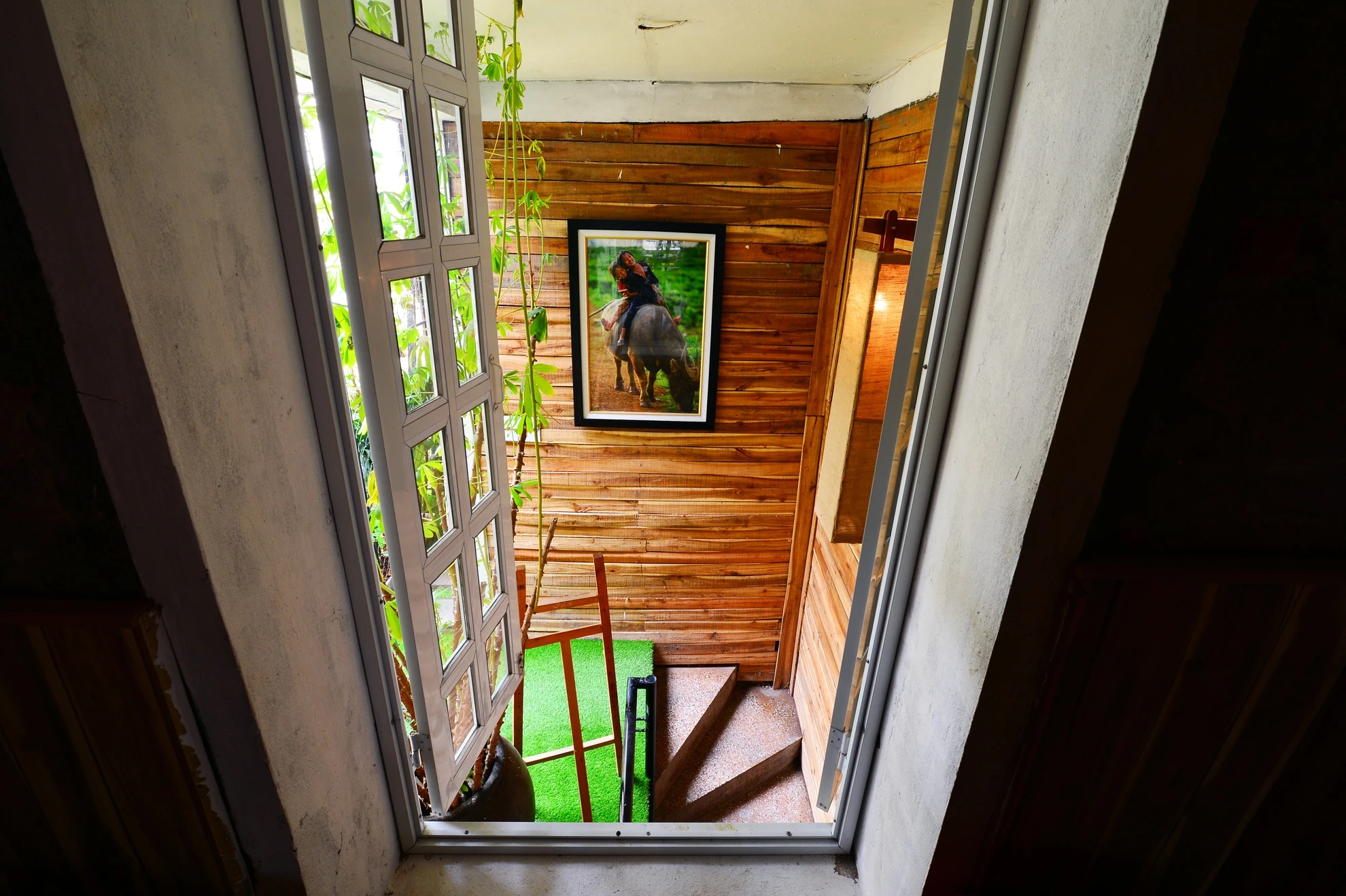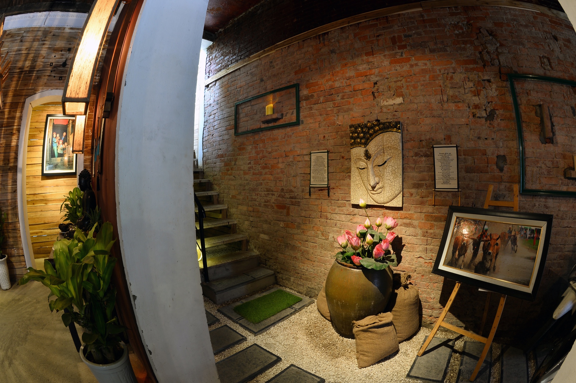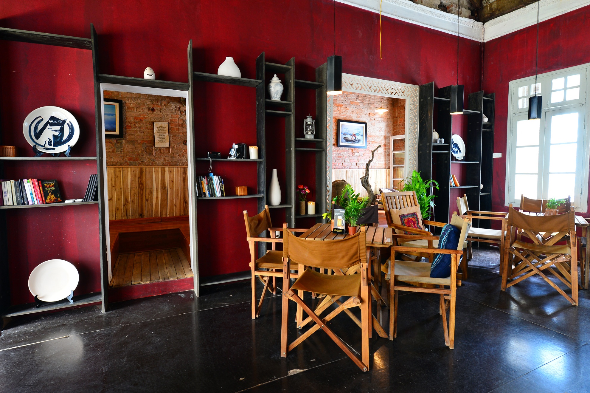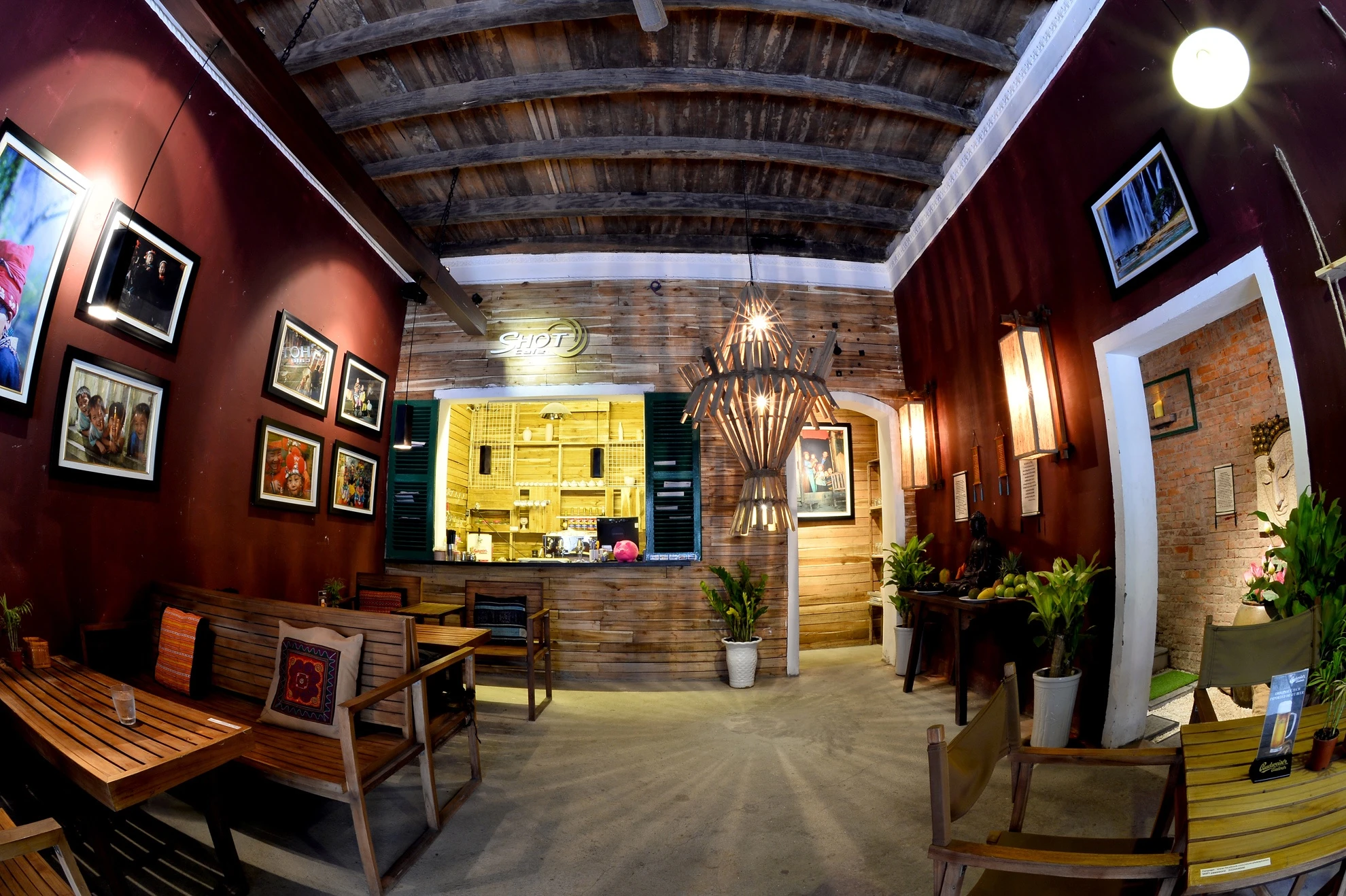 | Bên trong thiết kế theo trường phái thô và mộc, đồ đạc không đánh bóng cũng không véc ni hay sơn màu mè. Để tôn lên những bức ảnh đẹp chủ quán cho sơn tường tầng 1 màu nâu đỏ. |