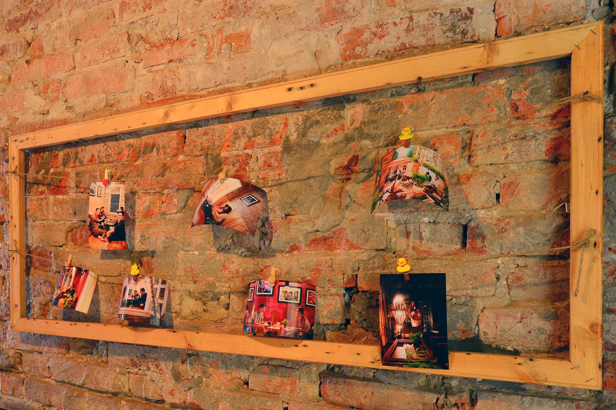 | Những bức ảnh chụp khách đến quán cũng được treo bên bức tường không trát. |