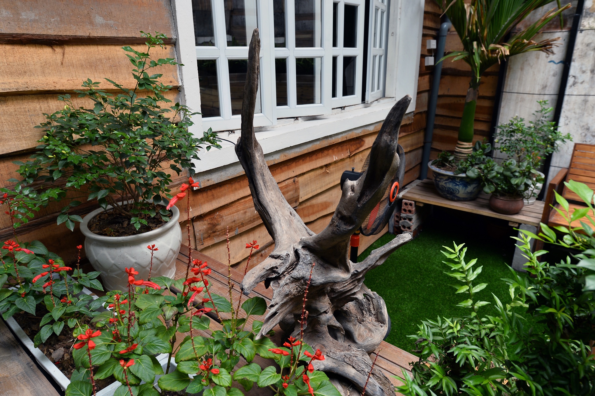 | Ngay cửa lối vào tầng 2, chủ quán trưng bày một cây gỗ lũa có hình con đại bàng mà anh cất công mang từ đảo Quan Lạn (Quảng Ninh) về sau khi nhặt được. |