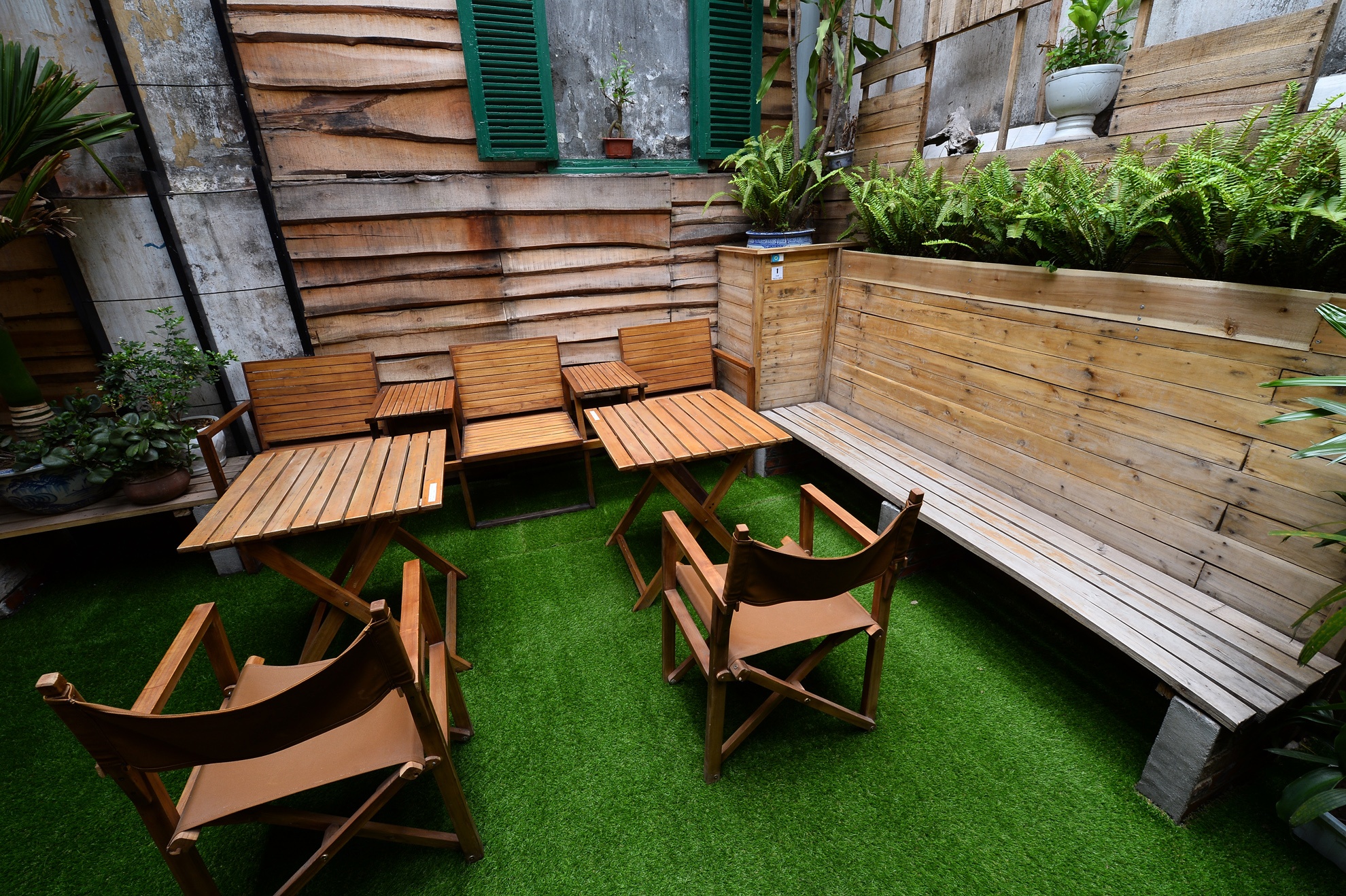 | Giữa hai tầng là một khoảng không gian như vườn nhằm phục vụ khách theo nhóm. Khu vực này anh đầu tư một thảm cỏ nhân tạo khá đẹp mắt. |