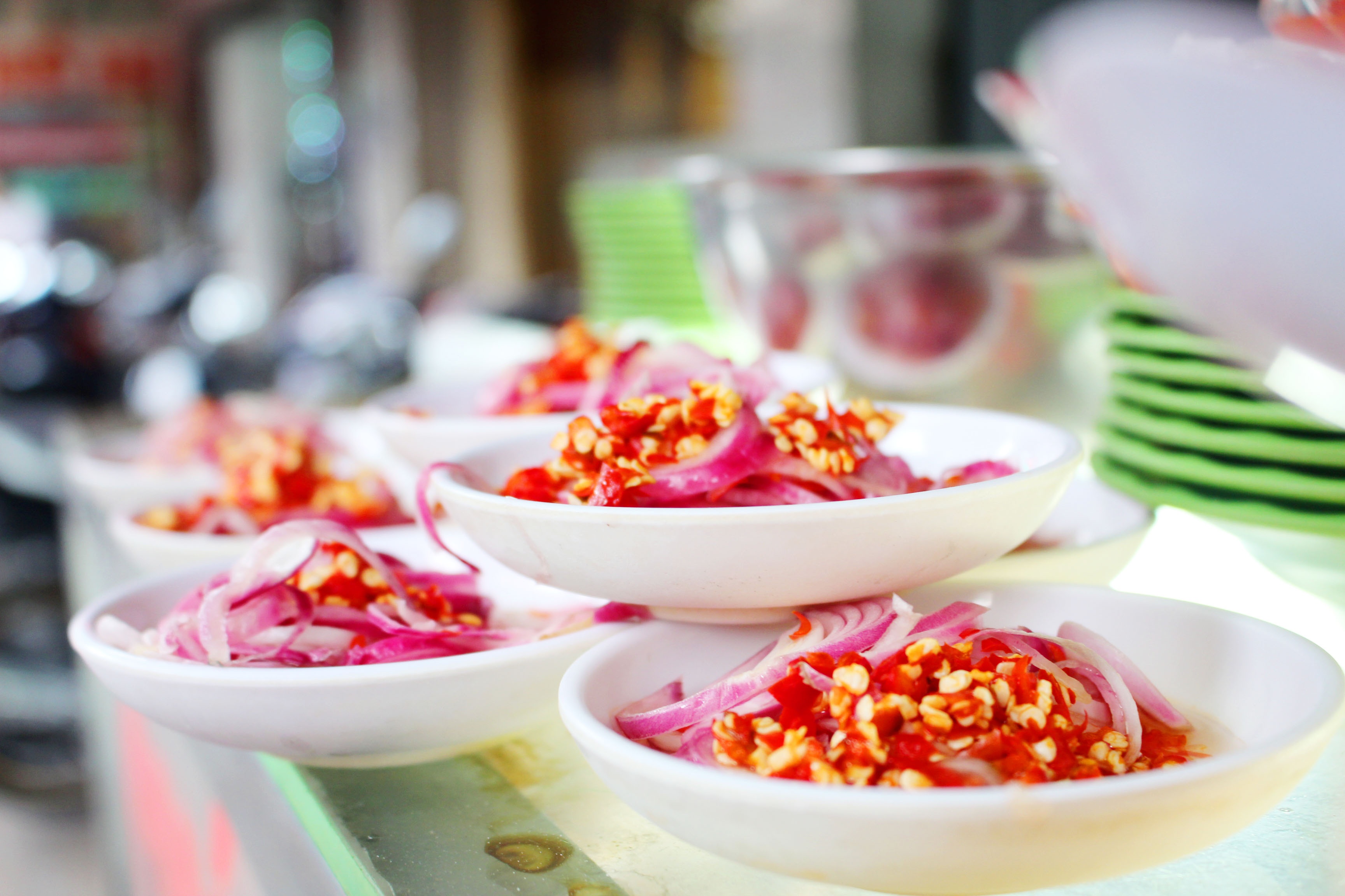 Bên cạnh dồi, quán cũng mê hoặc thực khách với một nguyên liệu ăn kèm có màu sắc, hương vị khá bắt mắt là hành tím bào mỏng ướp chua ngọt. Cách chế biến món này khá đơn giản. Chọn những củ hành tím to tròn, bào mỏng, ngâm với hỗn hợp gia vị được chế biến theo công thức riêng.
