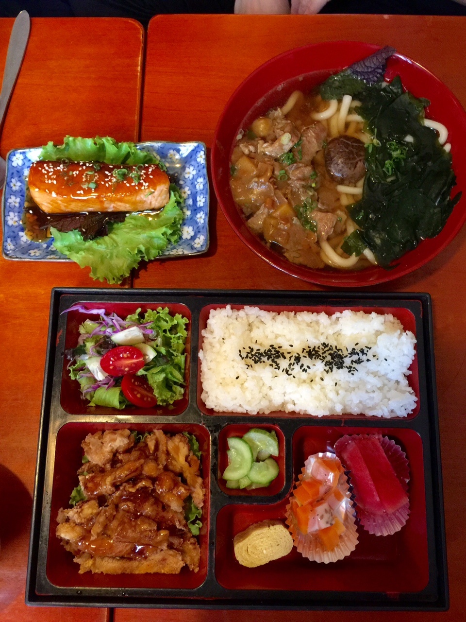 Dưới 300.000 đồng, đôi bạn có thể thưởng thức được đầy đủ cơm bento, mỳ udon, cá hồi và đồ uống.