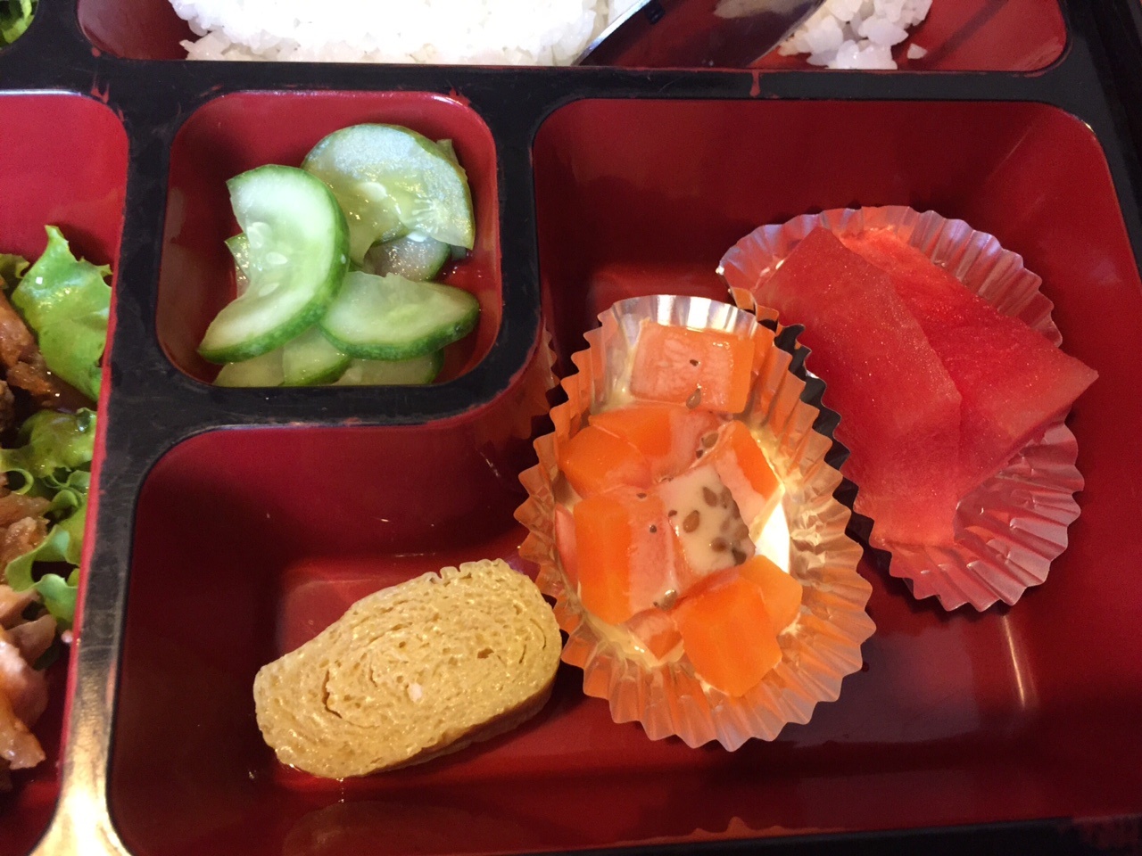 | Một bento ngoài cơm, thịt, cá luôn có kèm rau củ, salat và hoa quả tráng miệng. |