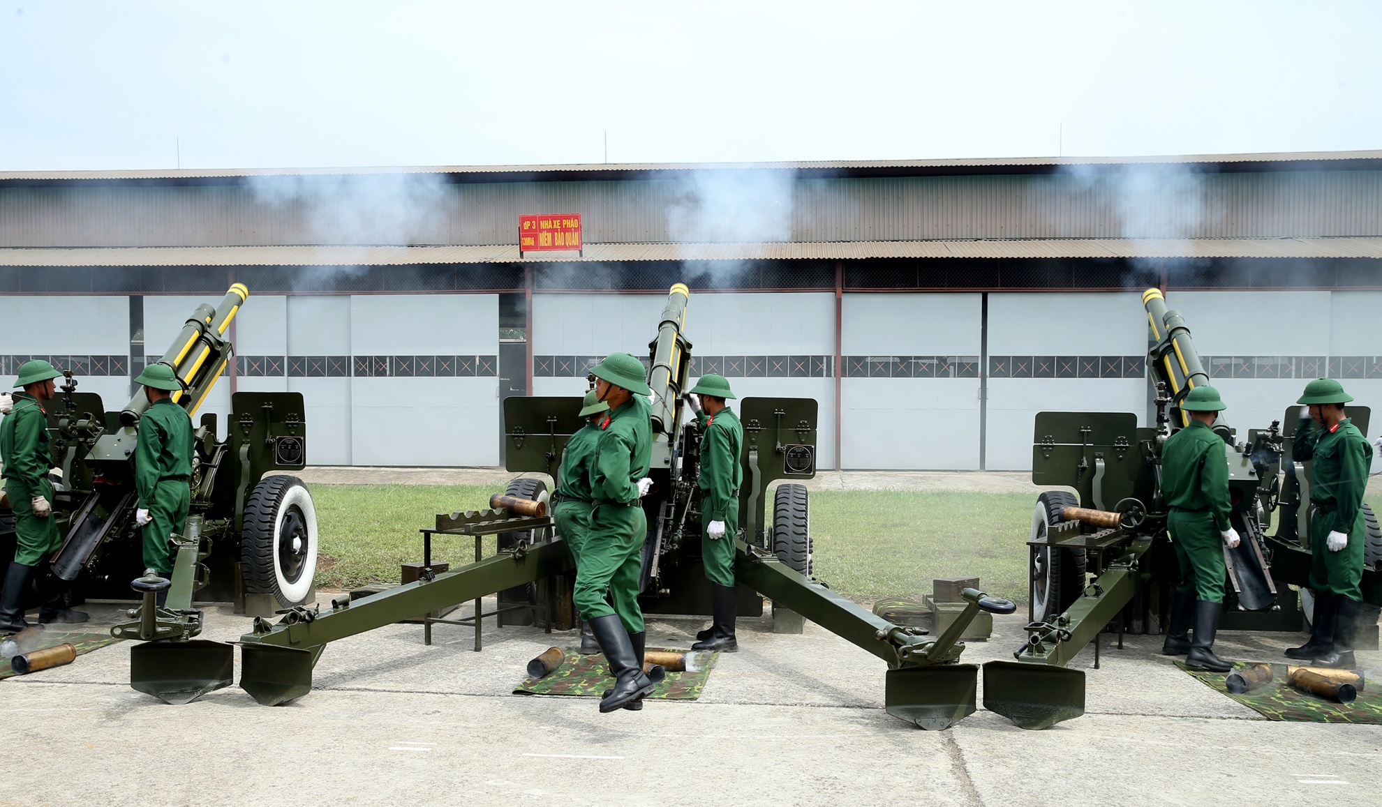 Đội pháo lễ luyện bắn đồng đều theo tiếng nhạc Quốc ca.
