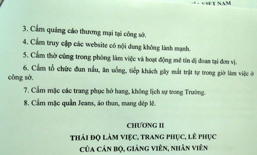 Quy chế văn hóa công sở của trường này ghi rõ, tất cả có 6 chương, 23 điều, có hiệu lực kể từ ngày ký ban hành và được phổ biến tới toàn thể cán bộ, giảng viên, nhân viên, sinh viên trong toàn trường ĐH Cửu Long. Theo đó, nhà trường đưa ra một danh mục “cấm” đối với cán bộ, giảng viên và sinh viên nhà trường, trong đó có mặc quần jeans, áo thun và đi dép lê…