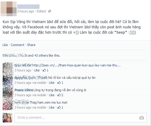 Đúng như dự đoán của giám khảo, sau khi phần thi này được phát sóng, “Quân Kun” tiếp tục nhận “đá” của khán giả. Một khán giả ghi: “Kun Sịp Vàng thi Vietnam Idol để sửa đổi, hối cải, làm lại cuộc đời hả? Có bị lầm không vậy. Vô Facebook sau đợt thi Vietnam Idol thấy còn post ảnh nude hàng loạt với tần suất dày đặc hơn trước thì có”.