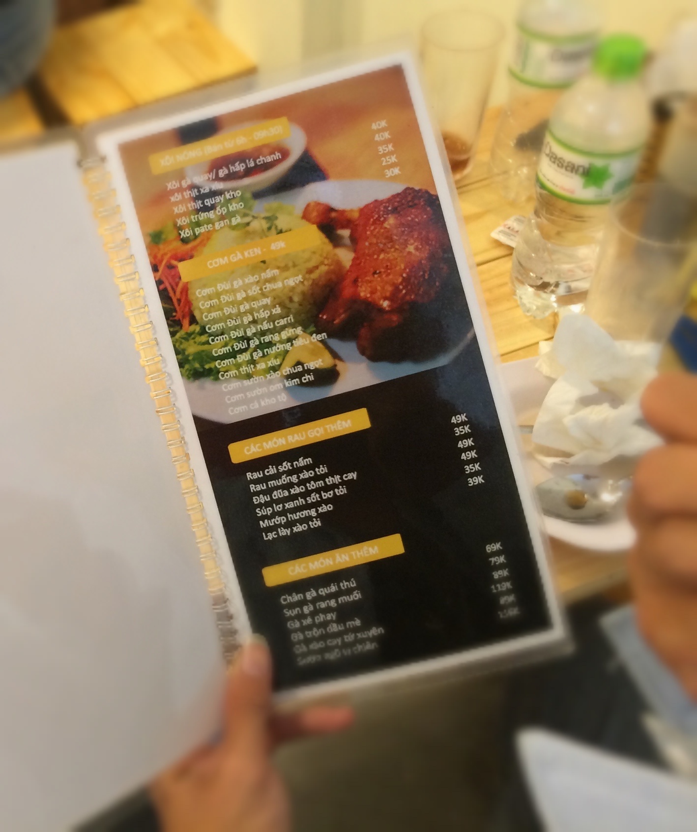 | Thực đơn cửa hàng tập trung chủ yếu vào các món cơm với mức giá chung là 49.000 đồng. Những món khác dao động từ 40.000-90.000 đồng. Quán chuyên về gà nên cơm, xôi hay thực đơn phụ đều xoay quanh gà như cơm đùi gà xào nấm, cơm đùi gà sốt chua ngọt, xôi gà quay, gà trộn dầu mè, chân gà quái thú... |
