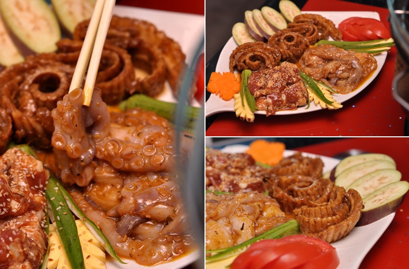 | Đĩa thịt thứ nhất có bạch tuộc, thịt sụn, hàm heo. |