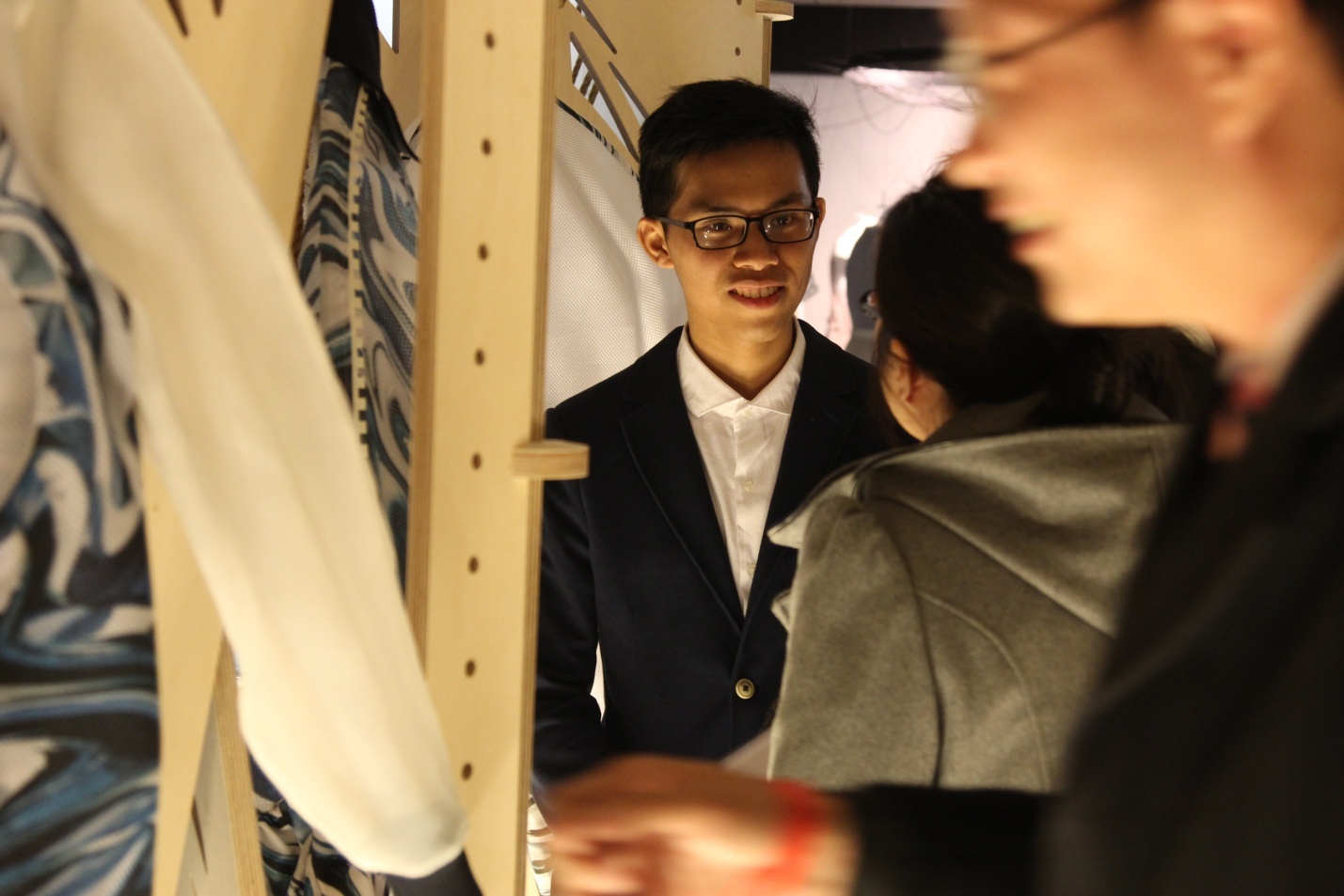 | Giang Tú mặc rất lịch sự. Anh trò chuyện với các vị khách mời bằng tiếng Anh lưu loát. Giang Tú giới thiệu BST Embracing Water với các vị quan khách. |