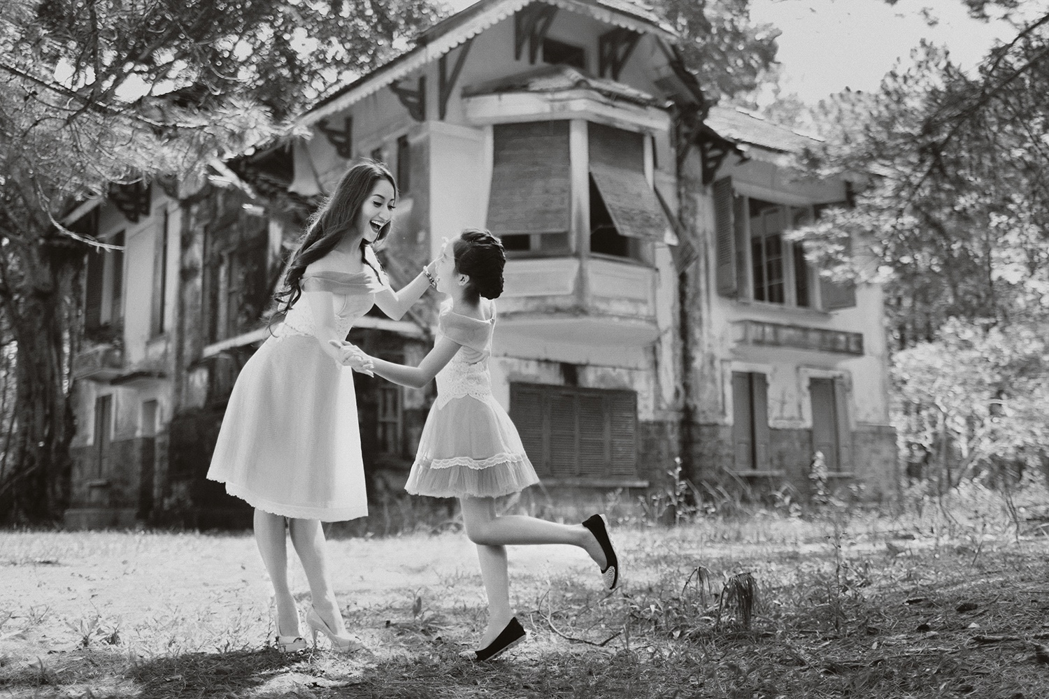 | Nữ kiện tướng Dance Sport và quán quân nhí cùng diện trang phục trắng tinh khôi nổi bật giữa không gian vắng vẻ. |