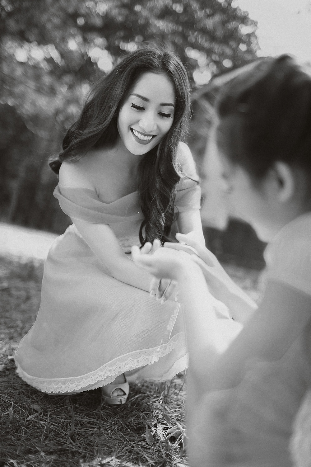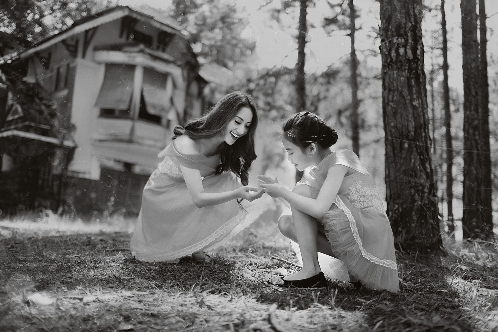 | Trang phục váy voan chất liệu nhẹ nhàng, tinh tế đồng điệu giúp bộ đôi giữa thiên nhiên với vẻ đẹp trong trẻo, dễ thương. |