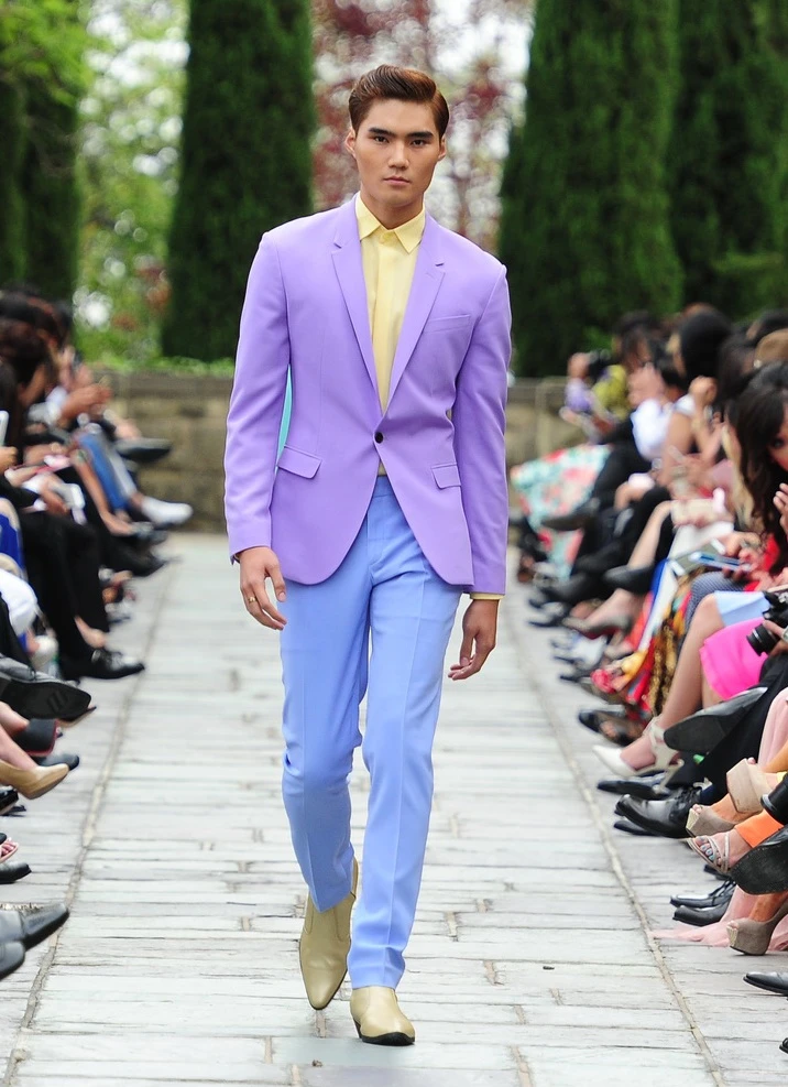 | Quán quân Vietnam's Next Top Model - Quang Hùng diện bộ suits nhiều sắc màu pastel nền nã. |