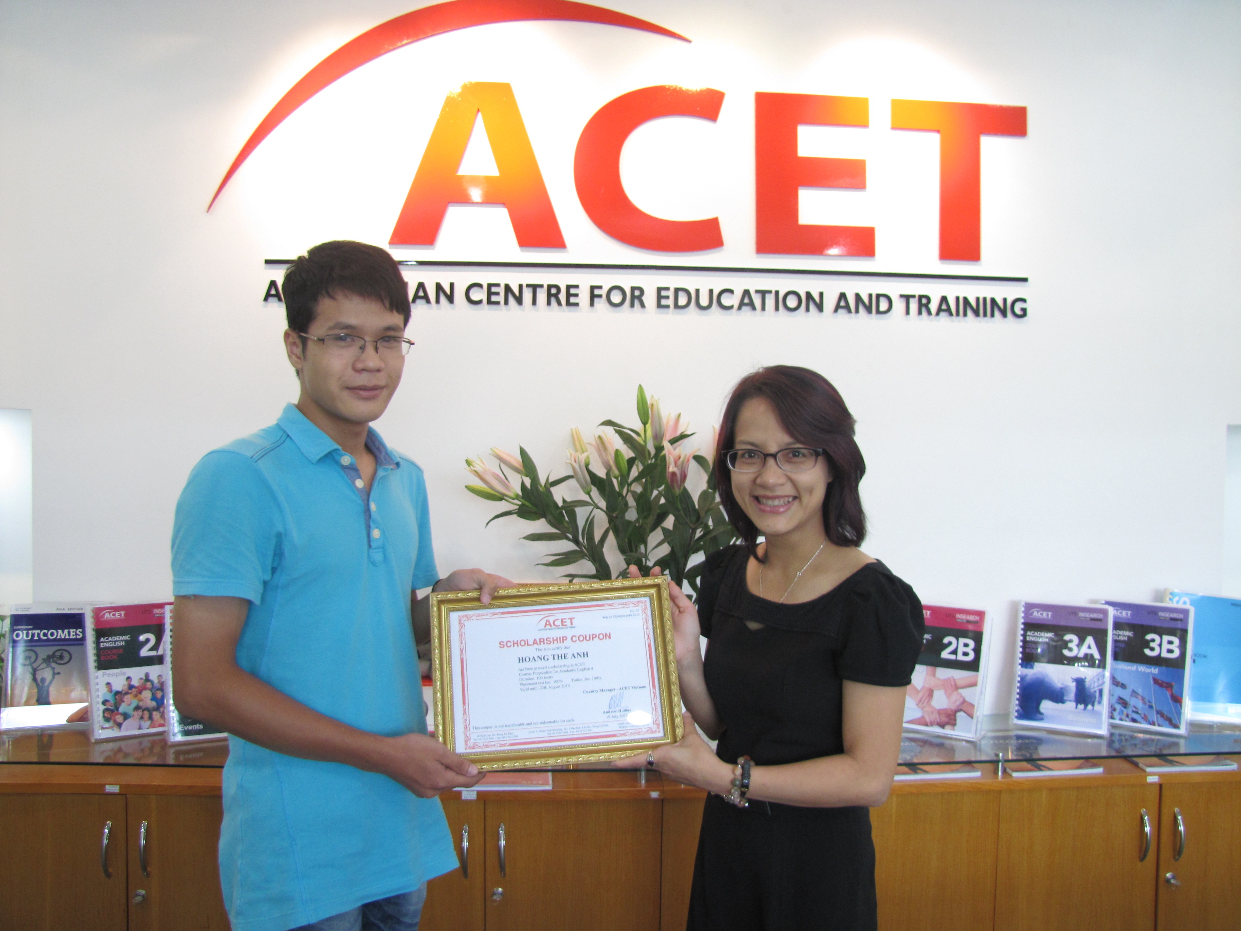 - Đối với em, thử thách tiếp theo chính là chinh phục kỳ thi IELTs với điểm số 7,0. Tiếng Anh không phải là sở trường nên chắc em sẽ phải dành rất nhiều thời gian rèn luyện kỹ năng này để chuẩn bị tốt nhất cho kế hoạch du học của mình. Em cũng đã quyết định lựa chọn Trung tâm Giáo dục và Đào tạo Úc (ACET) để theo học khóa luyện thi IELTS. Với sự tận tình và phương pháp giảng dạy của các thầy cô tại ACET, em tin là mình sẽ sớm đạt được mục tiêu này.