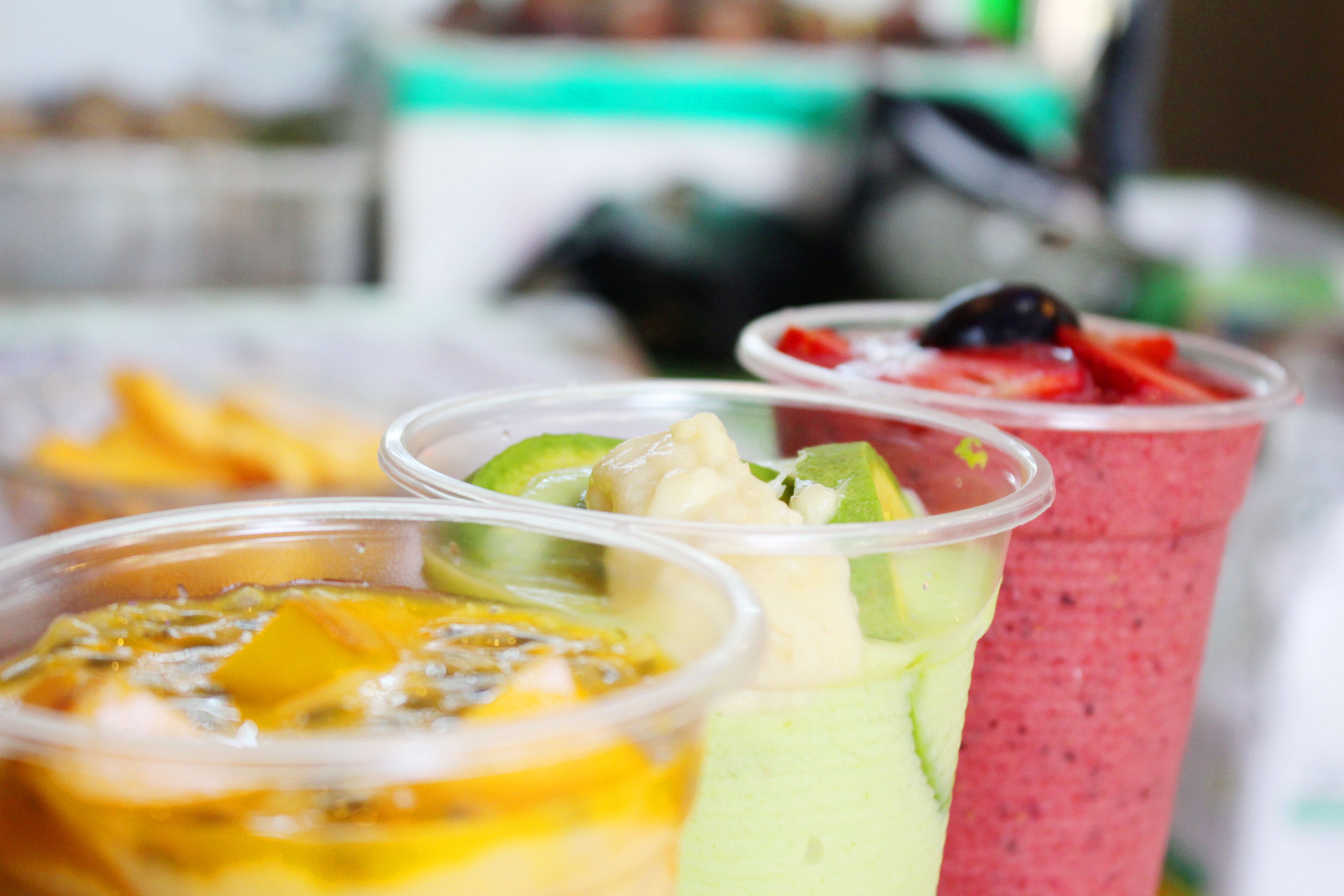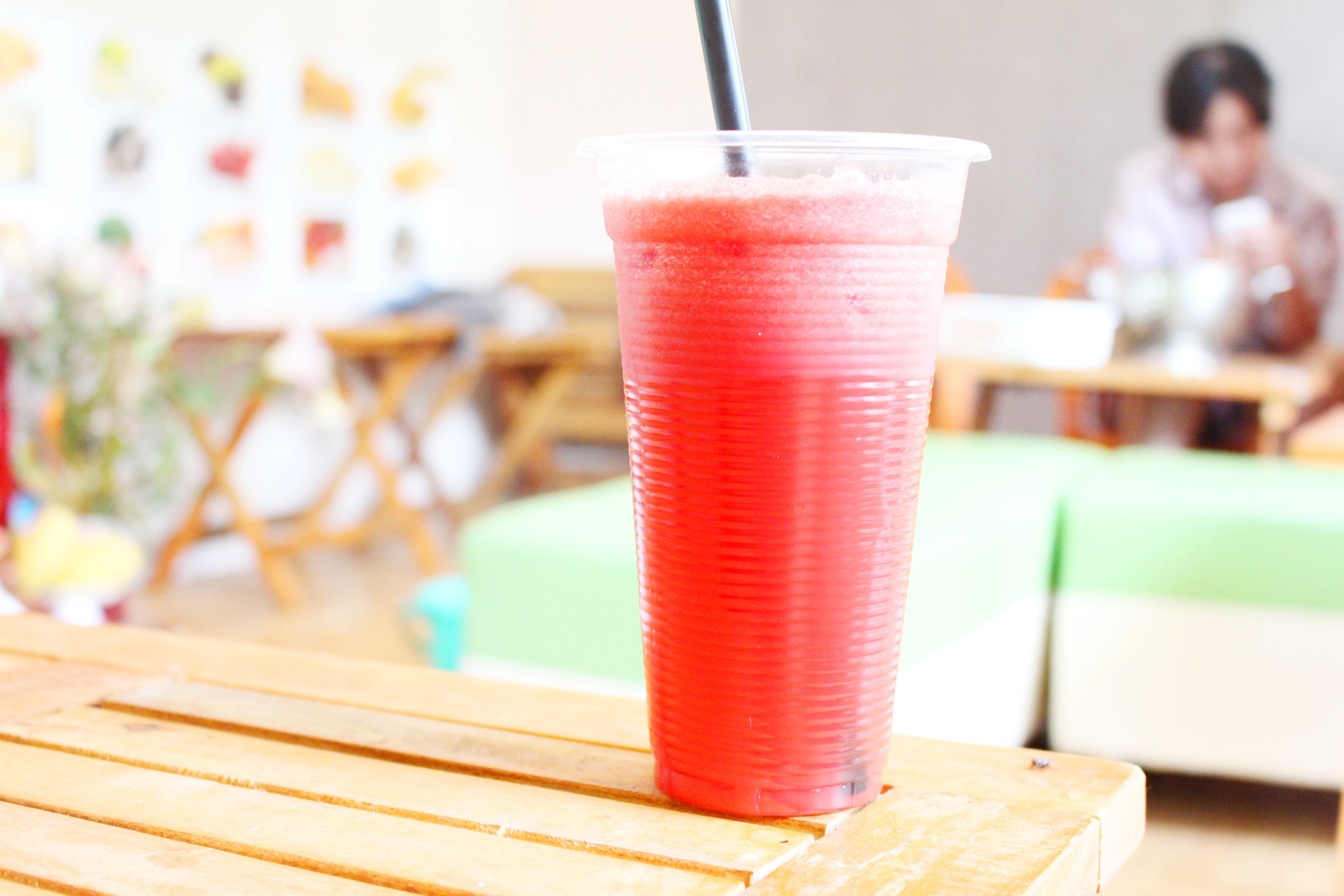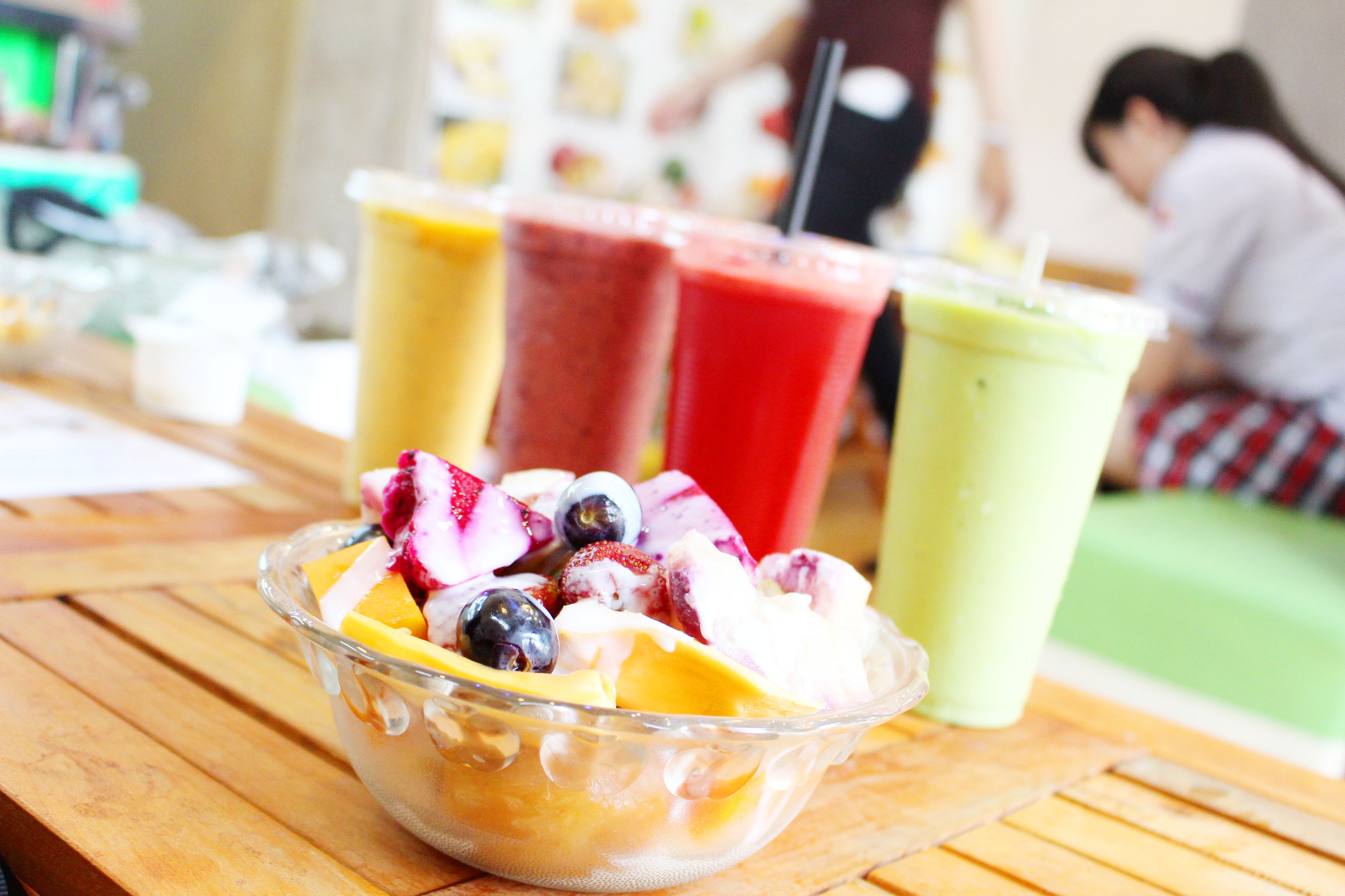 Đặc trưng của Banana Juice là trộn các loại trái cây thành món nước uống lạ miệng, kèm topping trái cây.