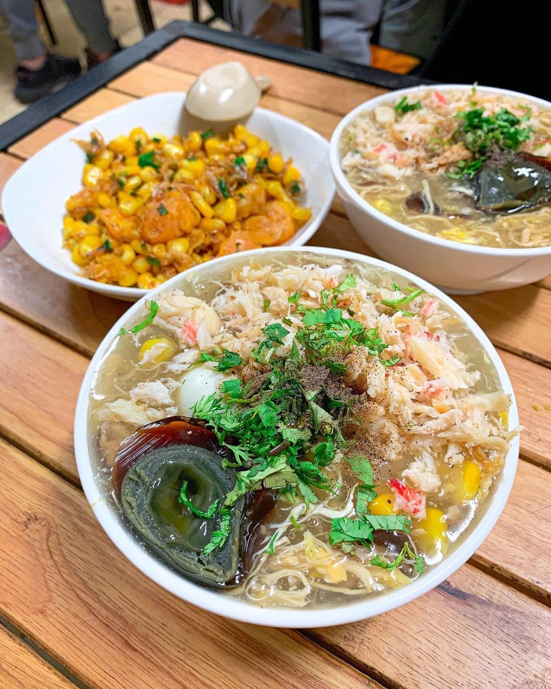 Súp cua & Cháo ếch Singapore trên con phố Phan Văn Trị là địa điểm quen thuộc của những người yêu thích món ăn này. Súp của quán có giá khoảng 40.000 đồng nhưng được yêu thích vì đa dạng các loại nhân. Phần nhân ăn kèm gồm trứng bắc thảo, trứng cút, trứng non, thanh cua, óc heo... Chiều tối là khoảng thời gian quán đông khách nên bạn phải chờ khá lâu. Quán cũng phục vụ tàu hũ, trà sữa, thạch rau câu để bạn tráng miệng với mức giá khoảng 15.000-25.000 đồng. Ảnh: _nymmm. |