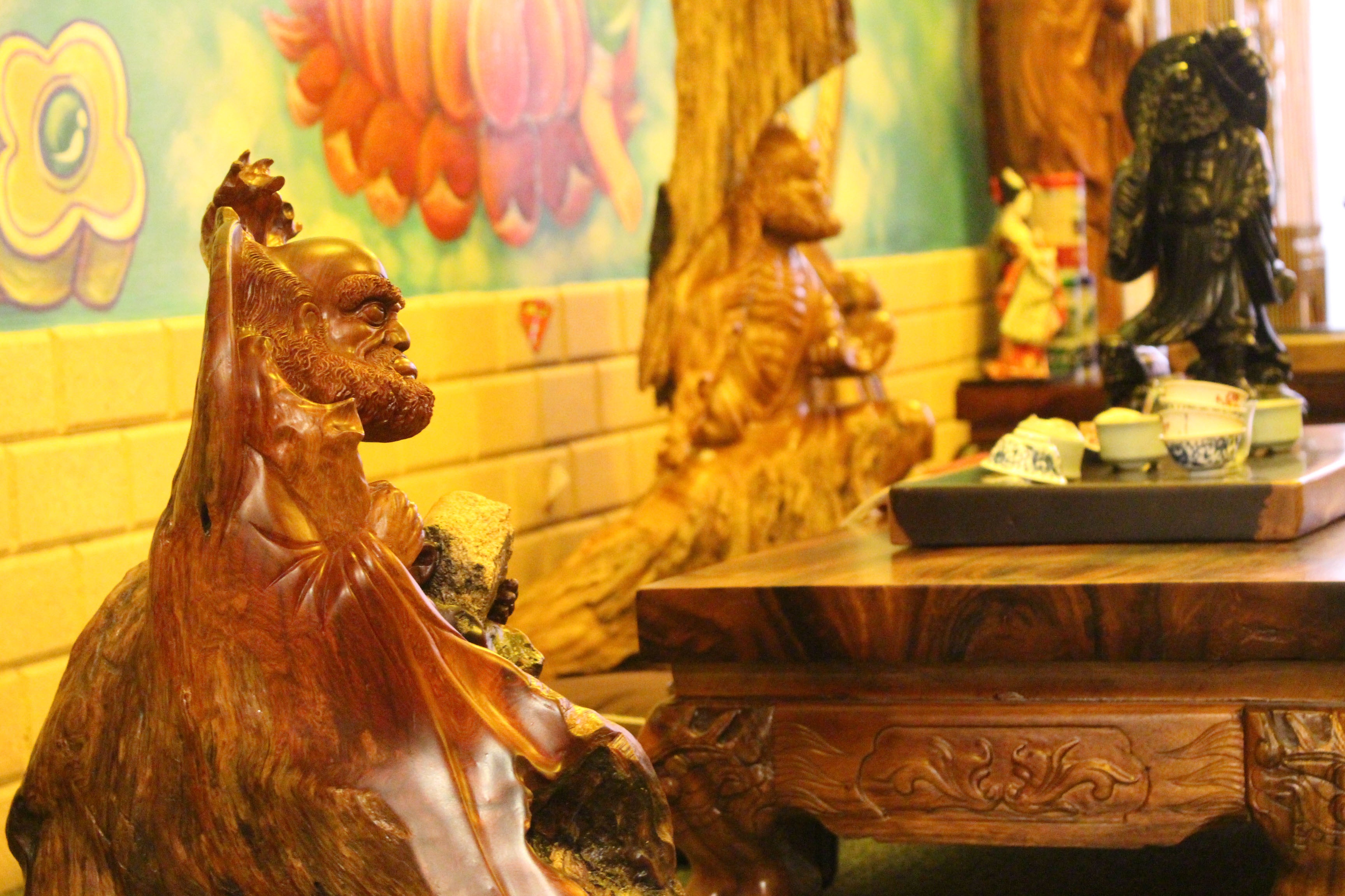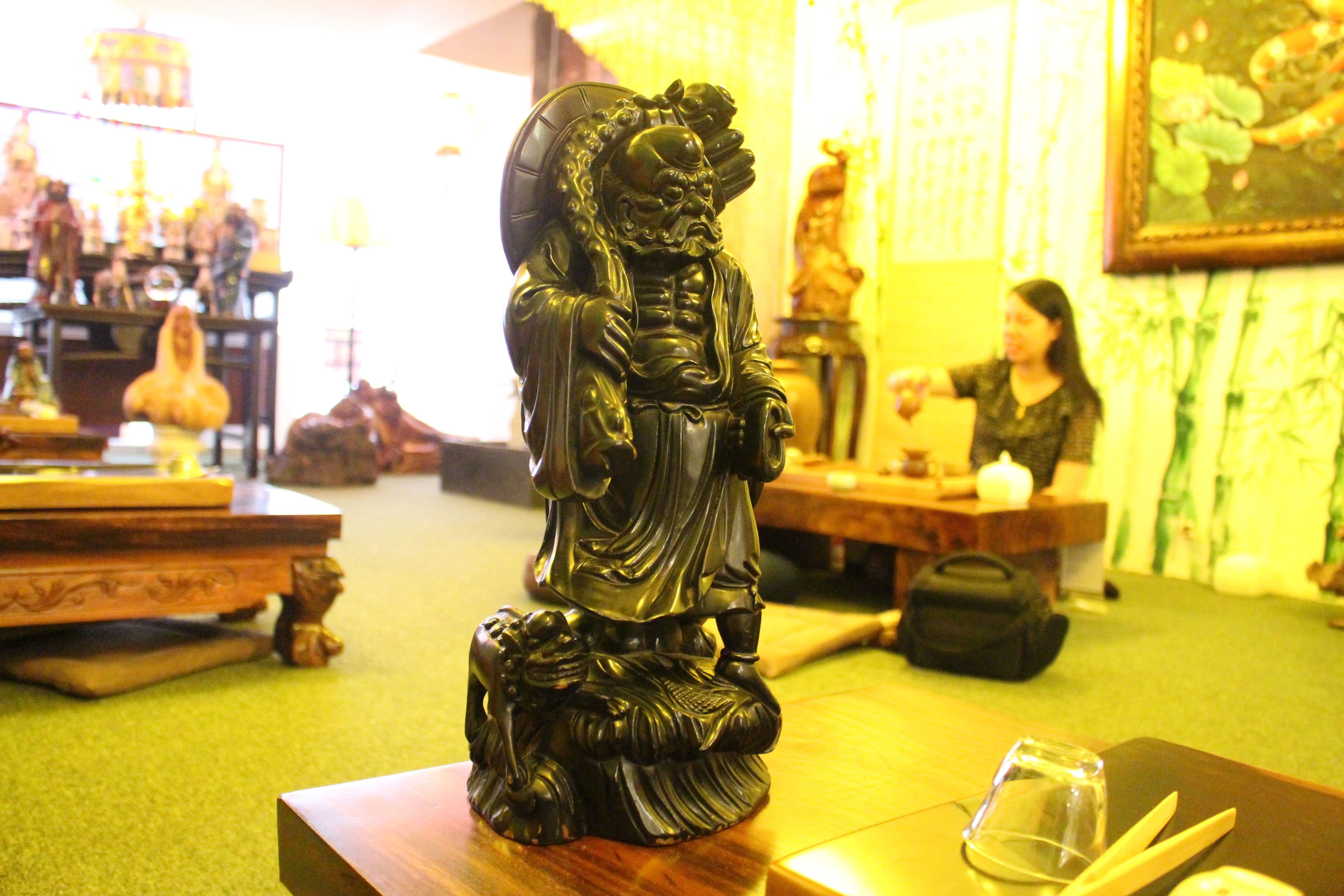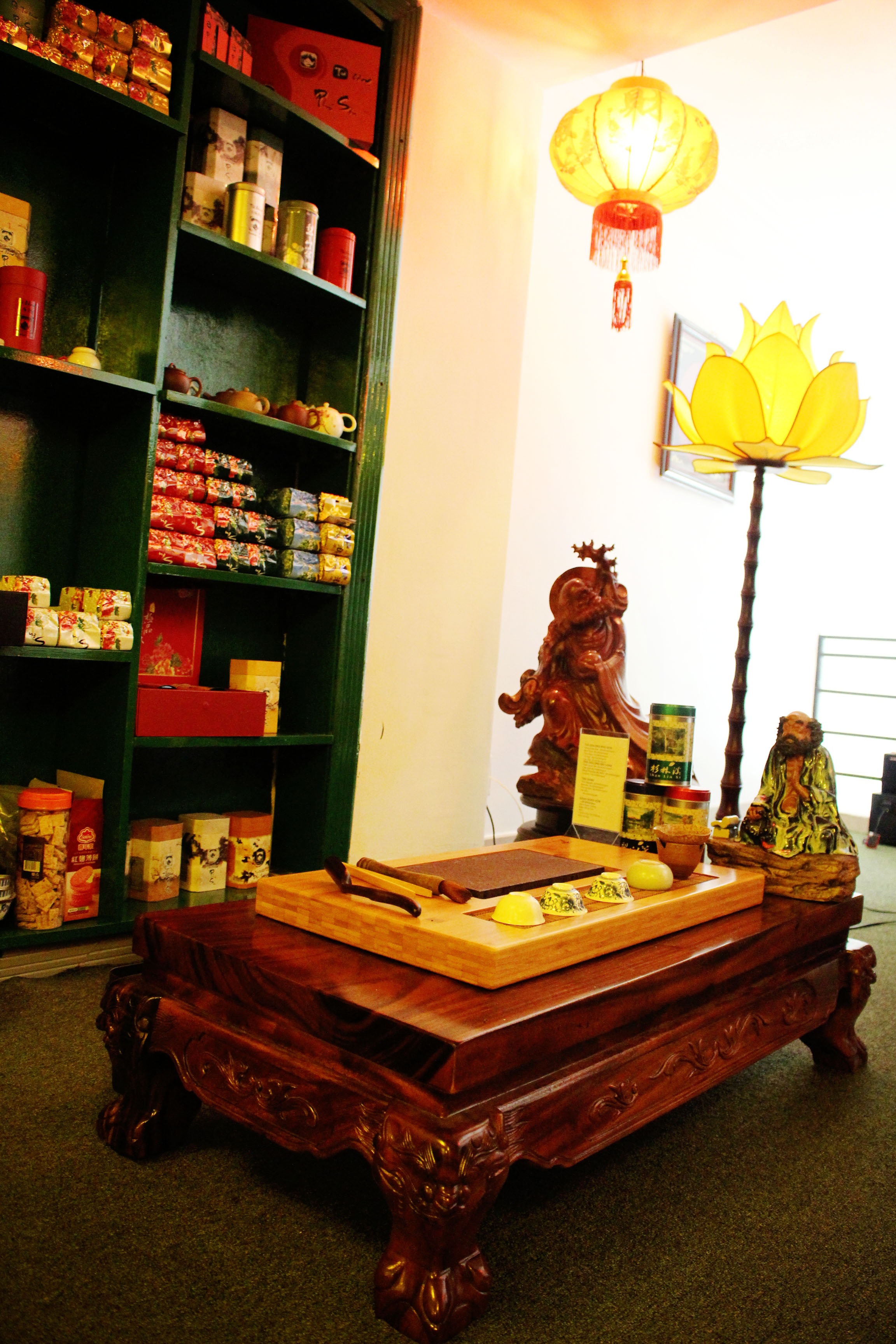 | Tầng một quán là nơi trưng bày và bán các sản phẩm bày trong phòng thờ, các linh vật phong thủy. |