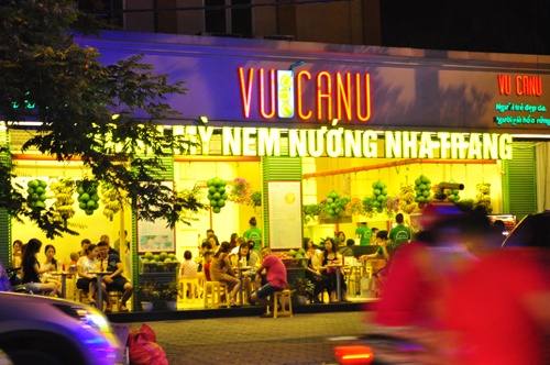 | Tại một quán ăn vặt phong cách Thái trên phố Nhà Chung, khách xếp hàng và ngồi tràn ra cả vỉa hè. |