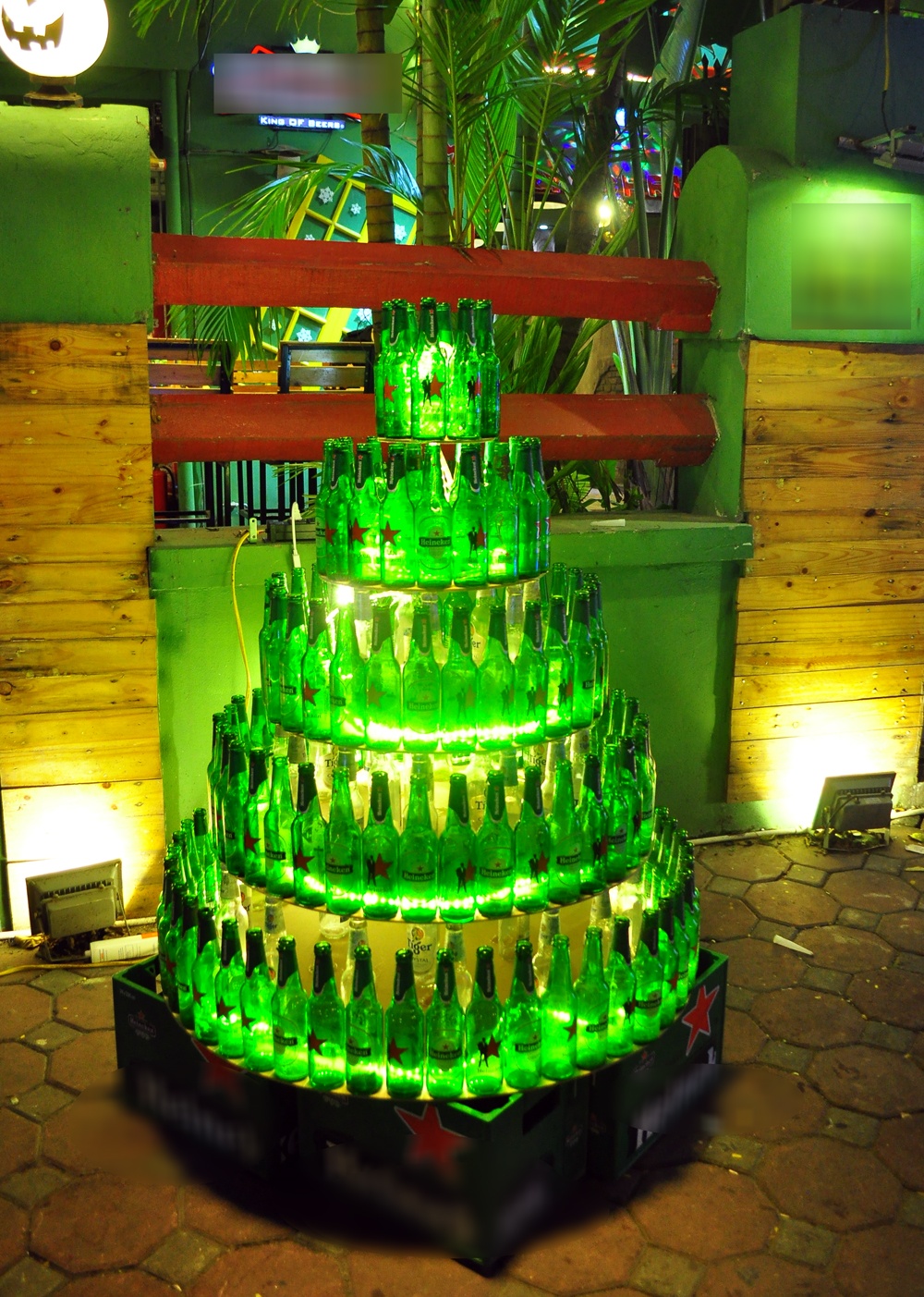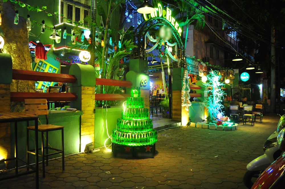 | Một nhà hàng beer trên phố Bà Triệu có ý tưởng trang trí độc đáo với cây thông làm từ vỏ chai bia. |