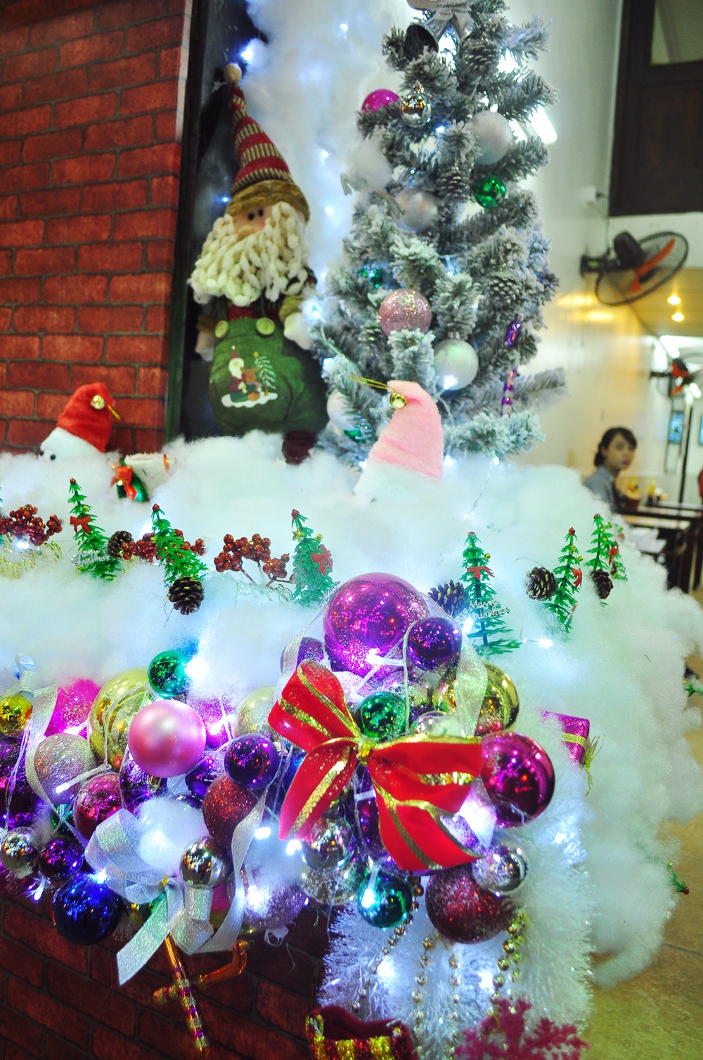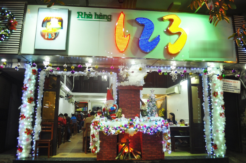 | Nhà hàng lâu năm ở phố Huế trang trí sống động với cây thông, ông già Noel, lò sưởi hồng. |