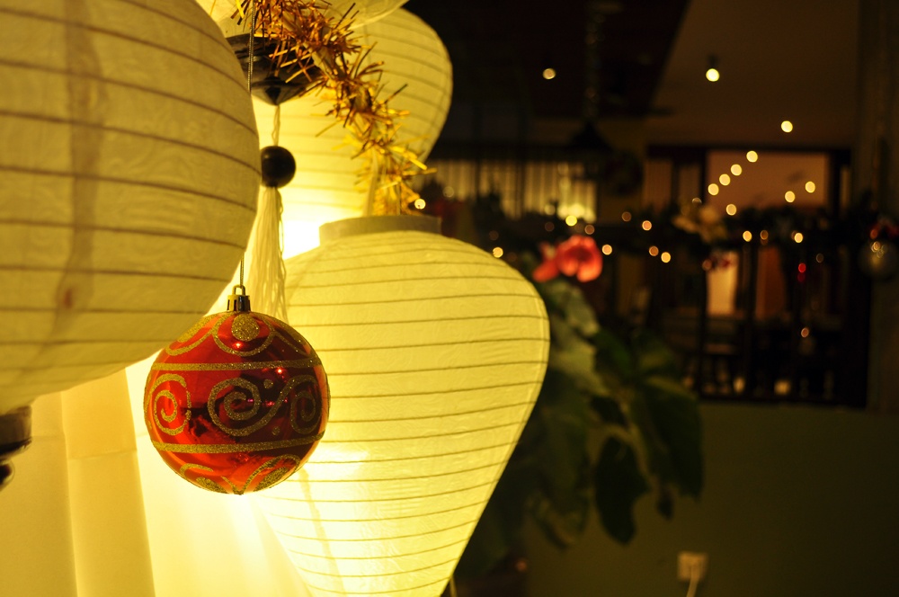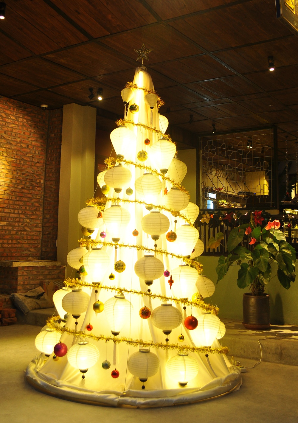 | Đây có thể coi là sản phẩm kết hợp giữa 2 nền văn hóa, khi quả châu của người phương Tây cùng với đèn lồng của người Á Đông tạo nên cây thông đặc biệt. |