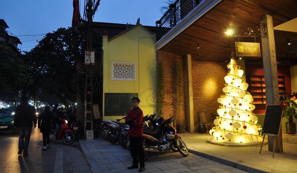 | Cây thông Noel do nhà hàng tự thiết kế, sáng trưng một đoạn phố Hàng Buồm. |