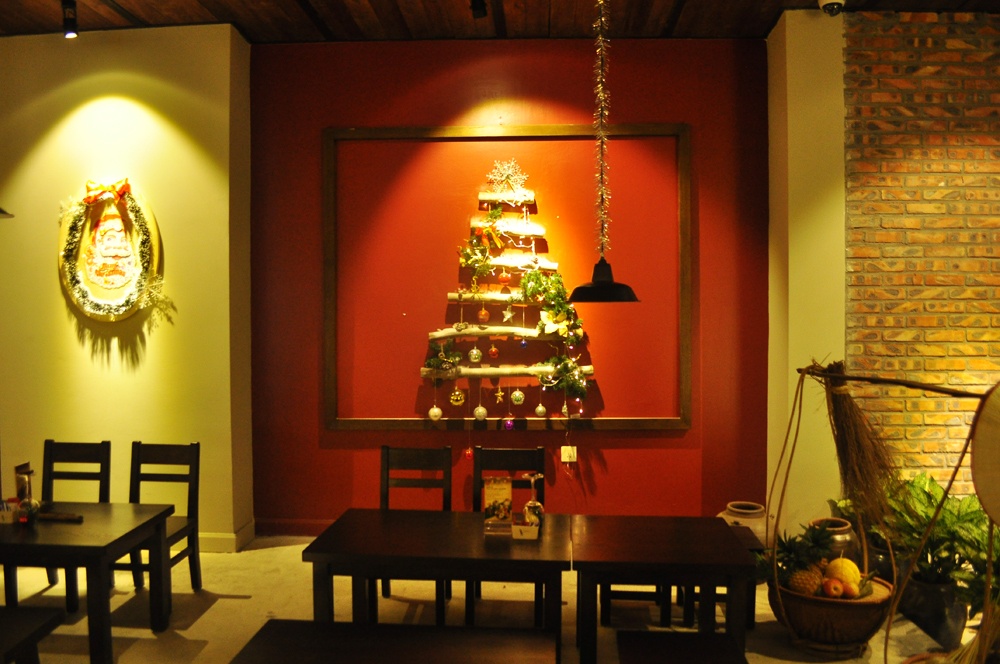 | Bên trong nhà hàng có thêm một cây thông handmade, nổi bật trên bức tường đỏ - sắc màu đặc trưng, mang đậm dấu ấn Giáng sinh. |